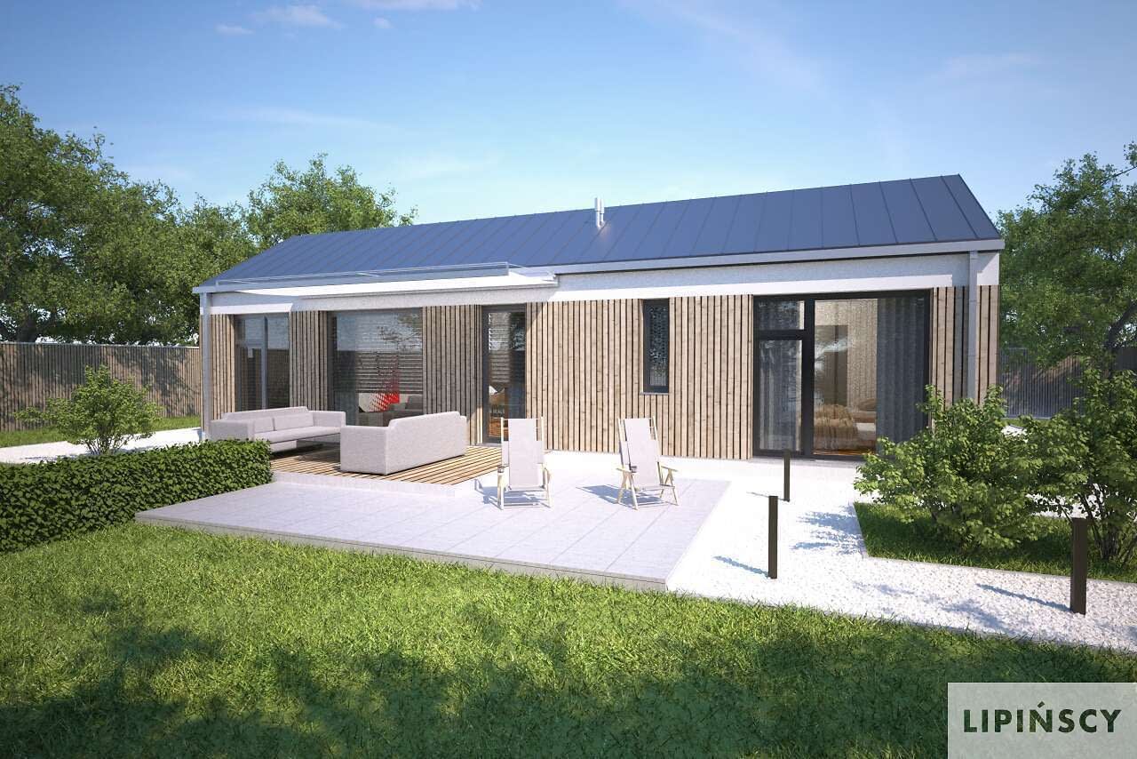 Niewielki, nowoczesny dom parterowy z dwuspadowym dachem, o zwartej bryle, przewidziany w standardzie energooszczędnym, dzięki czemu nie jest drogi w eksploatacji, a przy tym wygodny i funkcjonalny. Dzięki niewielkiej szerokości może być zlokalizowany nawet na bardzo wąskiej działce. Idealnie nadaje się dla pary lub niewielkiej rodziny. W domu zaplanowano wygodną sypialnię małżeńską, przytulny salon, doświetlony dużym oknem, aneks kuchenny z częścią jadalnianą, łazienkę oraz dodatkowy pokój, doskonale sprawdzający się jako gabinet lub pokój gościnny. Projekt zapewne zwróci uwagę Inwestorów, którzy szukają niewielkiego, wygodnego i nowoczesnego domu, który można wybudować na działce, gdzie płaski dach nie jest dopuszczony. W projekcie przewidziano ogrzewanie kotłem na gaz. Możliwa jest zmiana ogrzewania na pompę ciepła.