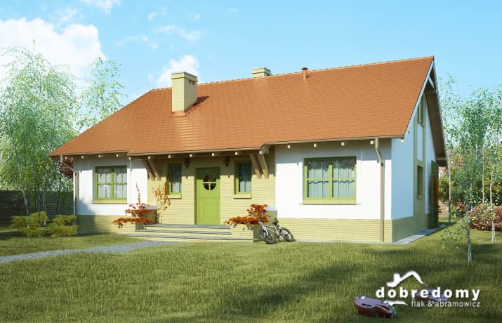 Dom parterowy, niepodpiwniczony, przeznaczony dla 4-5 osobowej rodziny. W części dziennej znajduje się wiatrołap z podręczną garderobą, pokój dzienny połączony z jadalnią i kuchnią, hall, pomieszczenie gospodarcze, łazienka oraz dodatkowy pokój/gabinet. W odizolowanej części prywatnej zlokalizowano dwie sypialnie z ogólnodostępną łazienką i korytarzem. Dom posiada możliwość doprojektowania schodów w hallu i zaadaptowania obszernego strychu na pomieszczenia mieszkalne.