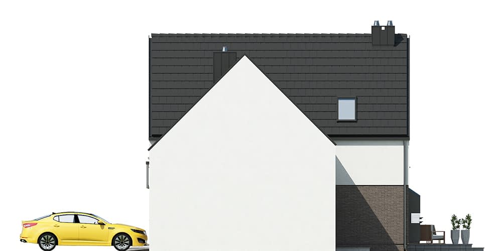 Nowoczesny dom jednorodzinny, w zabudowie bliźniaczej, niepodpiwniczony z poddaszem użytkowym i garażem oraz dachem bez okapów.