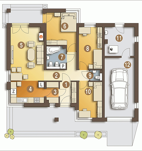 Przepiórka to ekonomiczny dom spełniający wymagania osób szukających rozwiązań wygodnych i funkcjonalnych przy małej powierzchni zabudowy. Jest przeznaczony dla 3-4 osobowej rodziny. Z racji zabudowy parterowej wygodny dla osób starszych. Funkcjonalność Przepiórki podkreśla wyraźny podział na strefy dzienną i nocną oraz łazienki : główną i WC. Przestronny, jasny salon z kominkiem połączony z otwartą kuchnią daje możliwość dogodnej aranżacji wnętrza. Pomieszczenie techniczne, spiżarnia i jednostanowiskowy garaż pozwalają na wygodne i swobodne korzystanie z części gospodarczej domu.