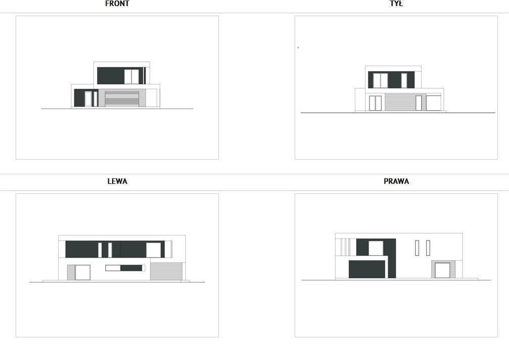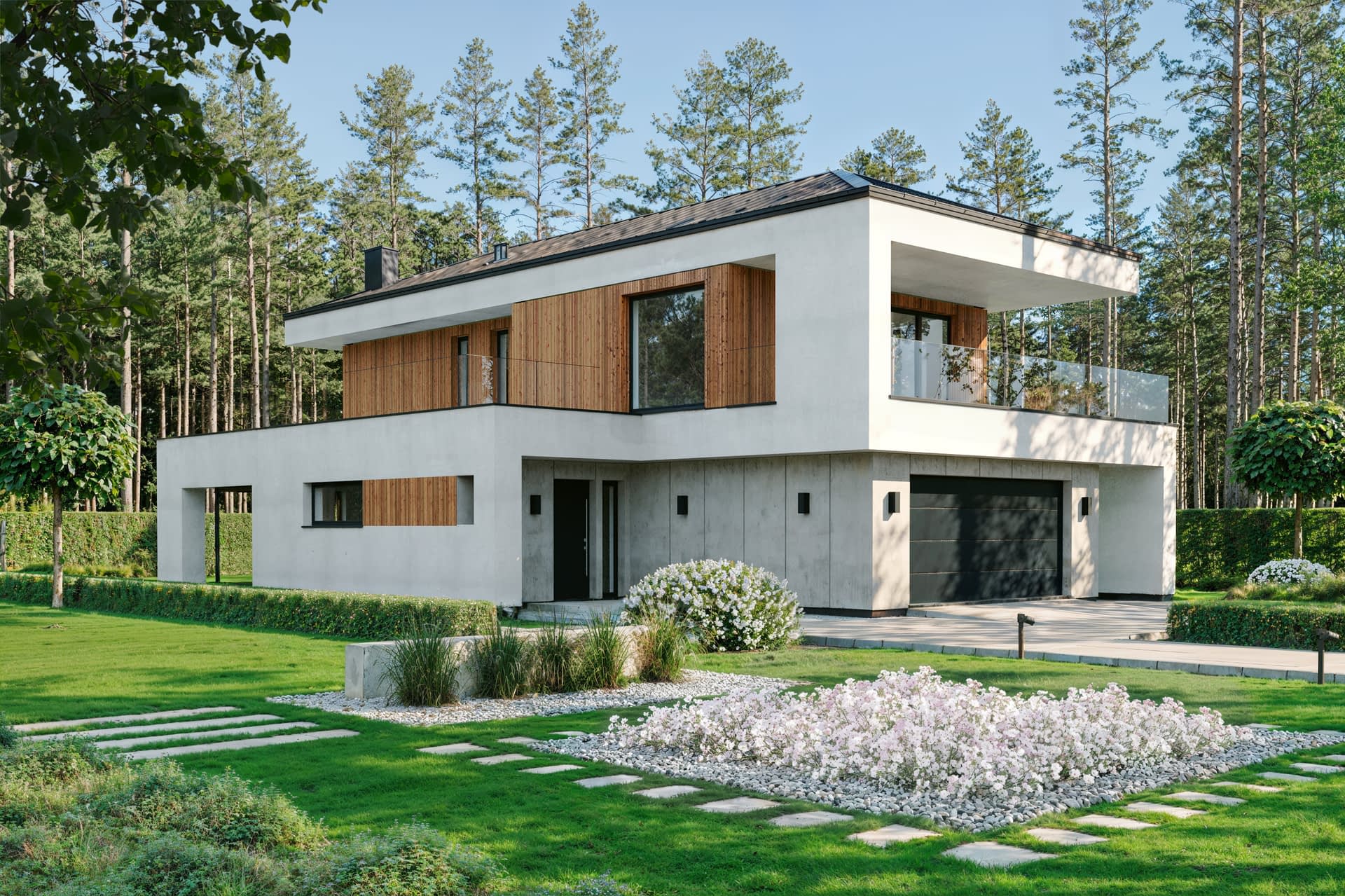 PRZESTRONNY D40 to nowoczesna bryła, tworzona przez białą i szarą elewację połączoną z deskami, oraz szklanymi balustradami tarasów.