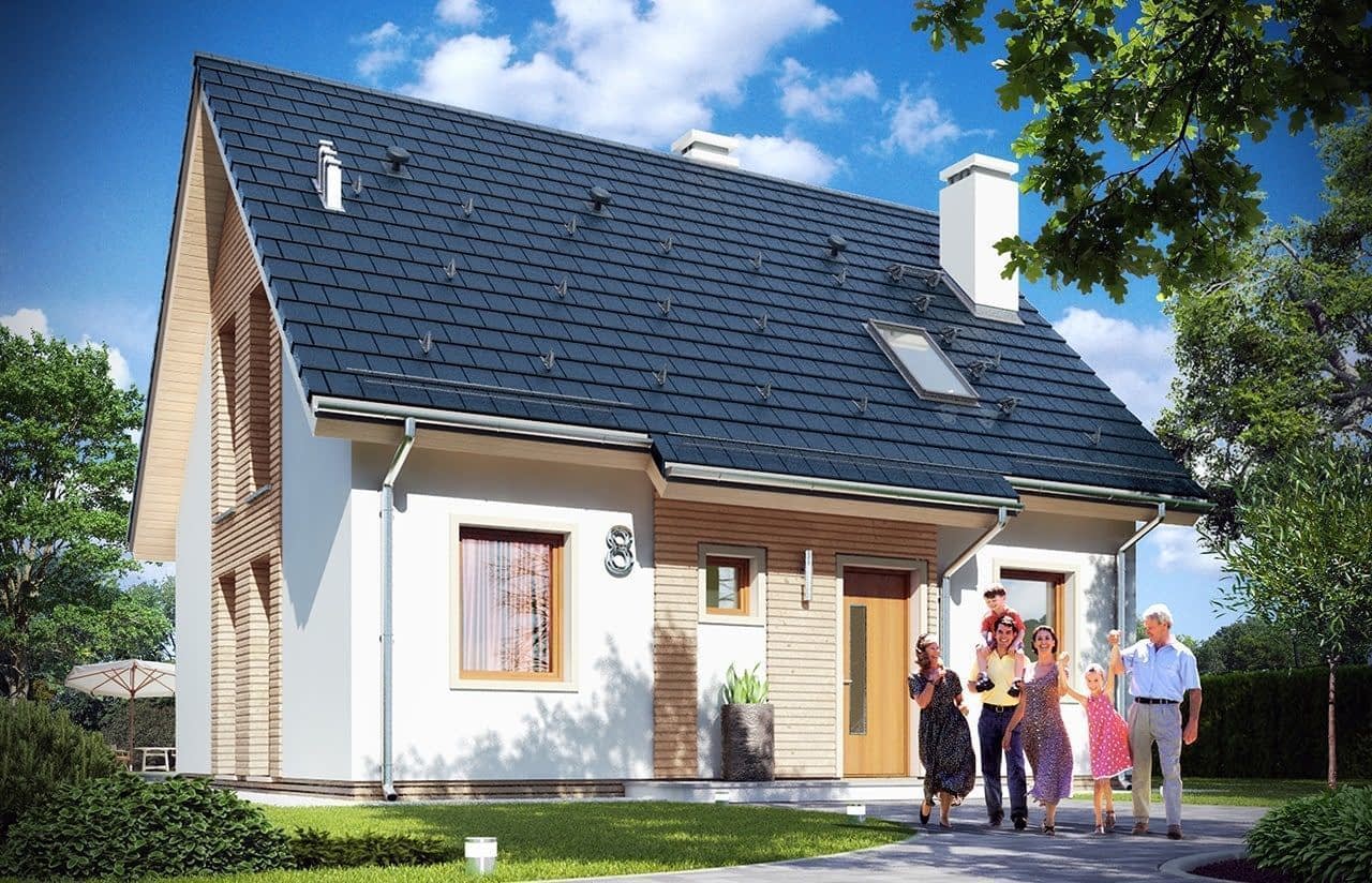 Projekt domu Przygoda 2 to sympatyczny dom dla cztero-pięcioosobowej rodziny - parterowy, z poddaszem użytkowym, o zwartej prostokątnej bryle przykrytej dwuspadowym dachem. Prosta elegancja domu i jego funkcjonalność idą w parze z energooszczędnością i nowoczesnością. Kształt domu, jego proporcje od razu przywołują obraz „małego białego domku”, takiego domku z kominem - z dziecięcych wyobrażeń. Budowa domu to wielka przygoda. Dlaczego nie zdecydować się na nią z naszą „Przygodą” ;). Proporcjonalna symetryczna bryła wpasuje się w każde otoczenie. Nowoczesne materiały i kolorystyka budynku dodają domowi sznytu. Wnętrze domu mieści w sobie cztery pokoje, dwie łazienki i oddzielną kotłownię - wiele, jak na niespełna stumetrową powierzchnię. Na parterze, w tej wersji projektu mamy mamy dużą przestrzeń dzienną połączonego salonu, holu i kuchni. Na poddaszu natomiast – trzy sypianie z łazienką. Projekt domu Przygoda 2 ma wnętrze ustawne i funkcjonalne. Konstrukcja domu jest bardzo prosta i przejrzysta - będzie łatwa w budowie i – co najważniejsze - rozsądna kosztowo. Bardzo dobre ocieplenia ścian, podłóg i dachu powodują, że dom jest energooszczędny. W łatwy sposób można go dostosować do standardu NF40. Niewielka powierzchnia użytkowa domu pozwala na zaliczenie projektu do programu MDM. Zapraszamy również do obejrzenia pierwszego projektu tej serii: projekt domu Przygoda.