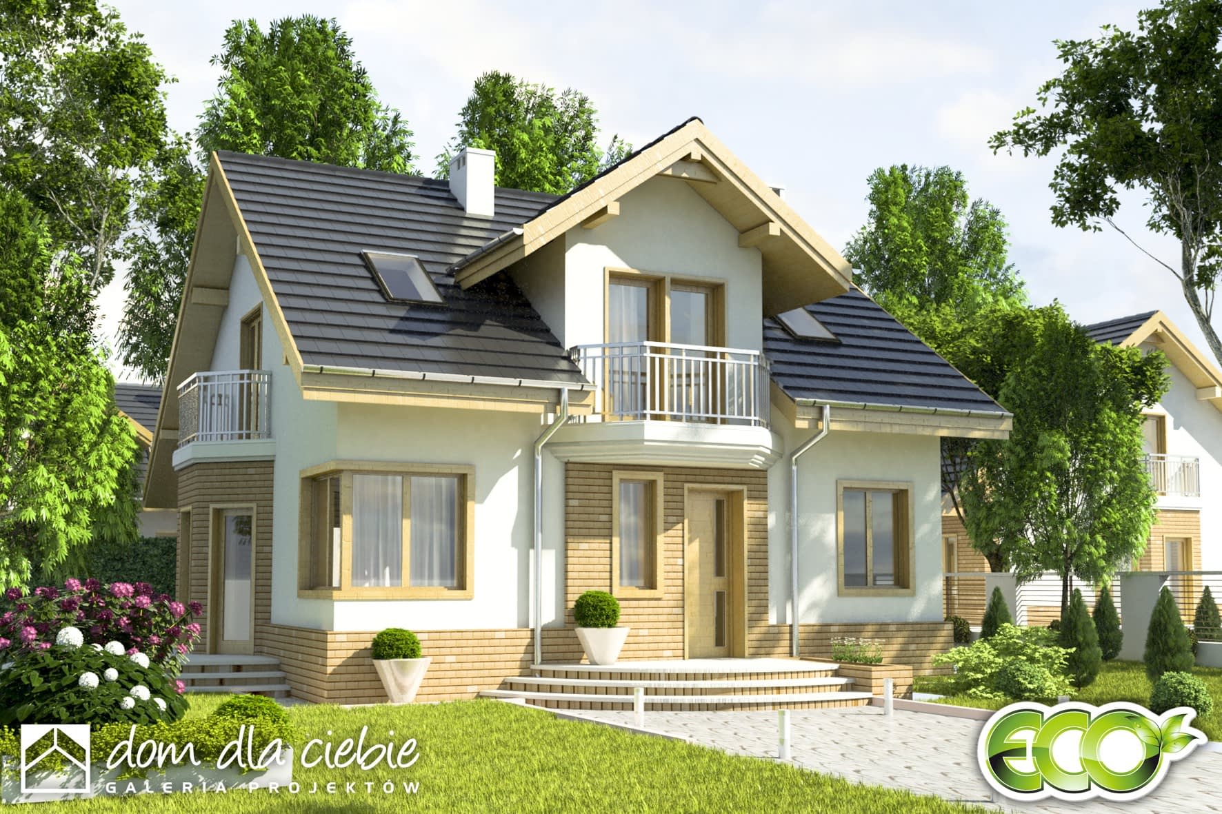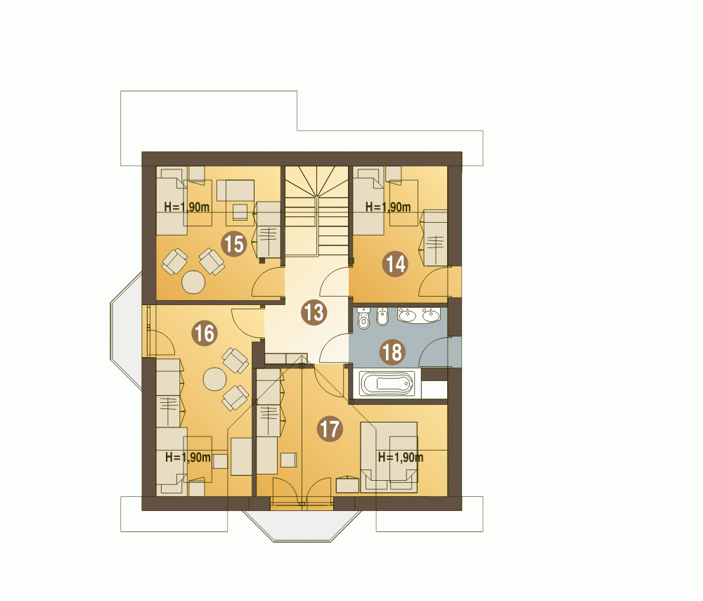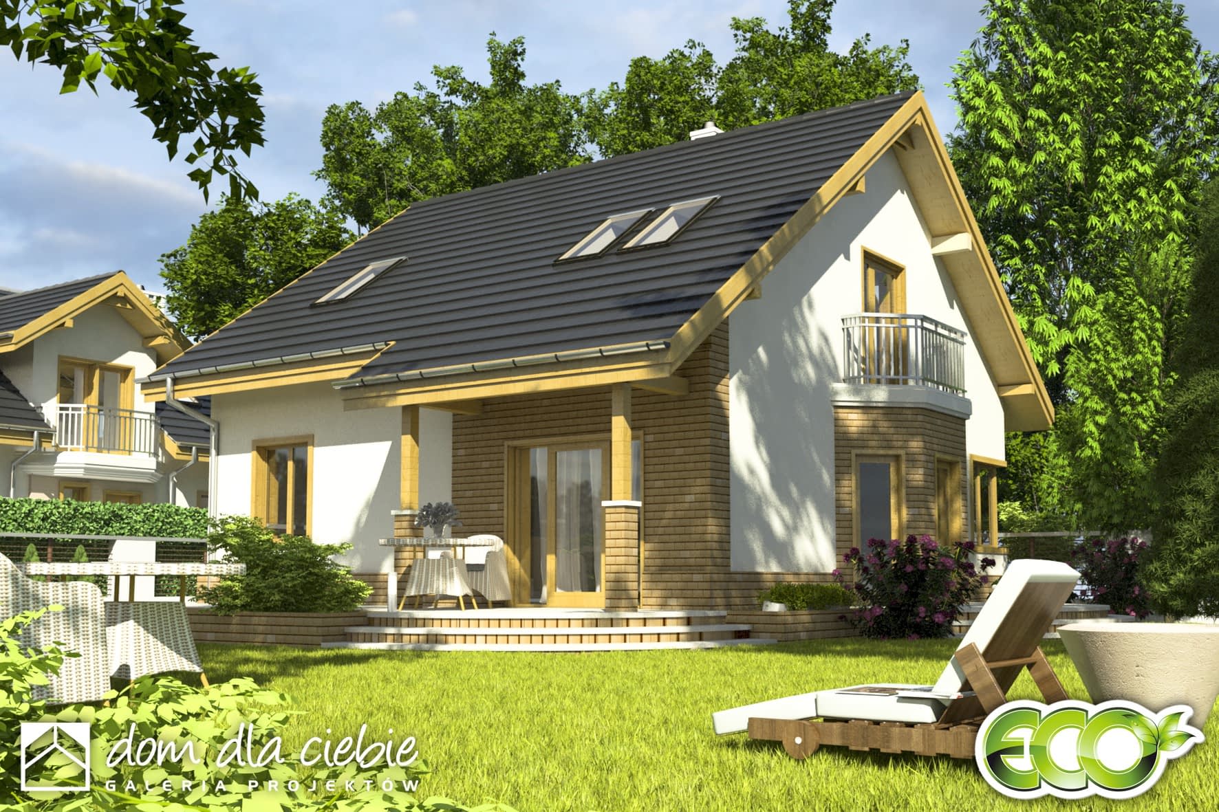Klasyczny dom z użytkowym poddaszem nawet dla 5-6cio osobowej rodziny, o proporcjonalnym wyglądzie i wyważonych detalach. Na parterze znajdziemy otwartą przestrzeń obejmującą salon ze schodami na poddasze, jadalnię oraz kuchnię ze spiżarnią. Zaprojektowano tu także dodatkowy pokój, dużą łazienkę oraz sporą kotłownię przewidzianą na różne rodzaje paliw ( do wyboru). Na tym poziomie znajdziemy także kominek oraz garderobę. Piętro przeznaczone na strefę indywidualną to cztery sypialnie i łazienka z wyjściem na taras. Puszczyk to uroczy dom z efektownym zadaszeniem w formie balkonu nad wejściem. Tradycyjna architektura budynku świetnie wpisze się w każdy krajobraz.