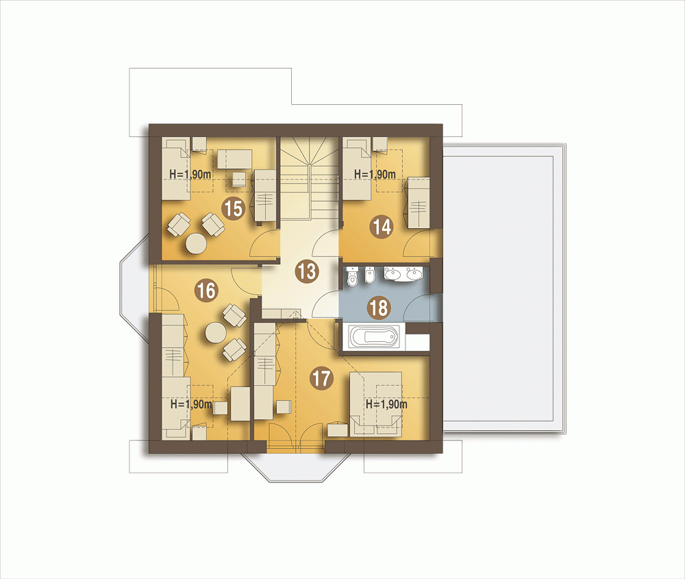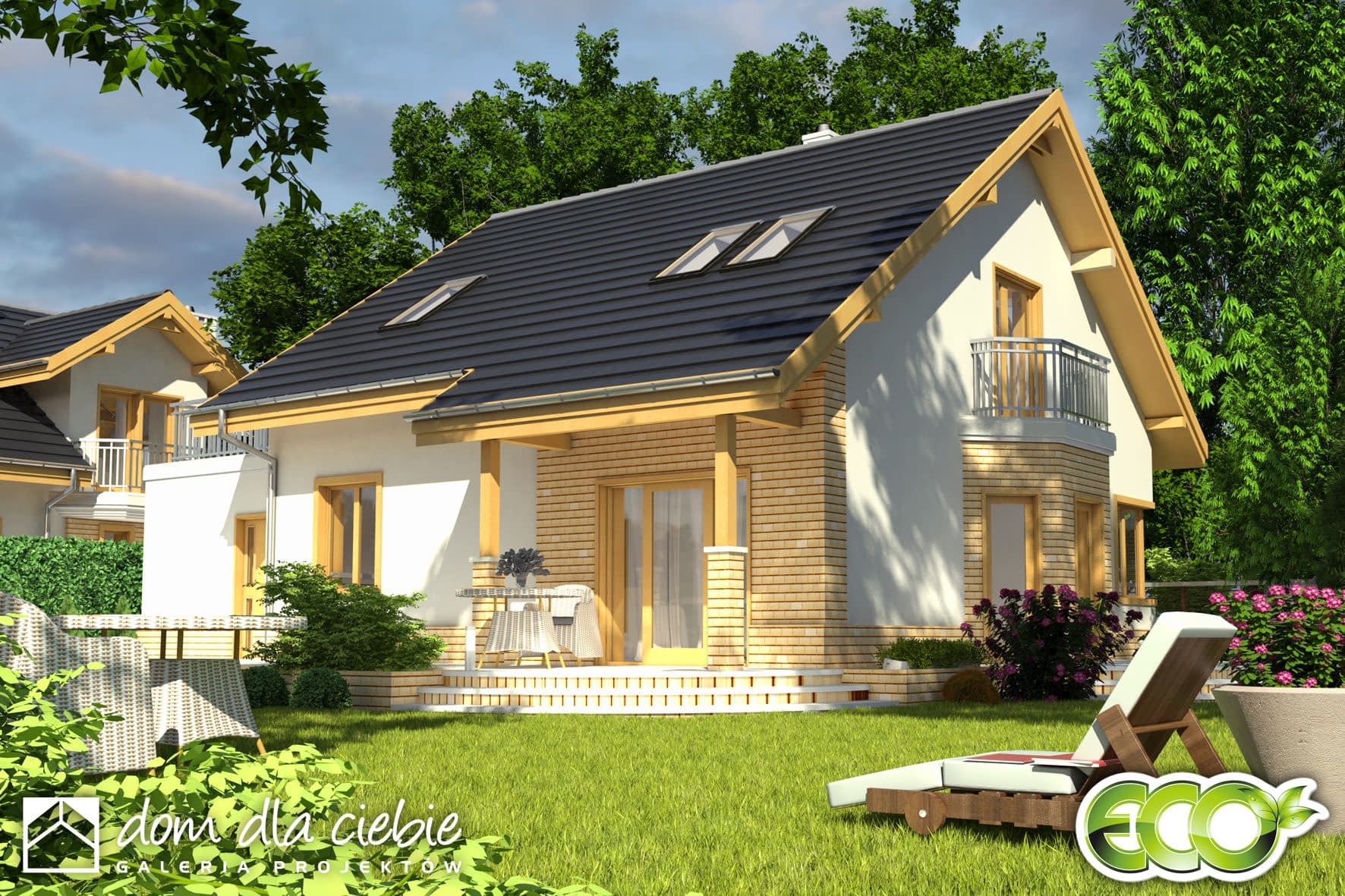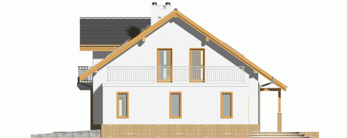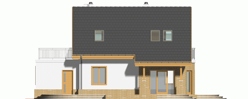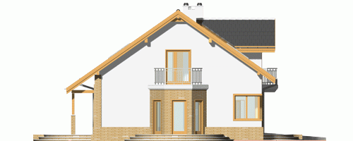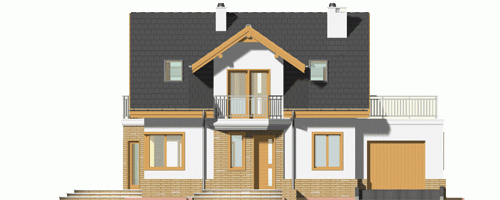 Klasyczny dom z użytkowym poddaszem nawet dla 5-6cio osobowej rodziny, o proporcjonalnym wyglądzie i wyważonych detalach. Na parterze znajdziemy otwartą przestrzeń obejmującą salon ze schodami na poddasze, jadalnię oraz kuchnię ze spiżarnią. Zaprojektowano tu także dodatkowy pokój, dużą łazienkę oraz sporą kotłownię przewidzianą na różne rodzaje paliw ( do wyboru). Z kotłowni przechodzimy do garażu i dalej do pomieszczenia gospodarczego. Na tym poziomie znajdziemy także kominek oraz garderobę. Piętro przeznaczone na strefę indywidualną to cztery sypialnie i łazienka z wyjściem na taras. Mamy tu również taras wygospodarowany na garażem i pomieszczeniem gospodarczym. Puszczyk to uroczy dom z efektownym zadaszeniem w formie balkonu nad wejściem. Tradycyjna architektura budynku świetnie wpisze się w każdy krajobraz.