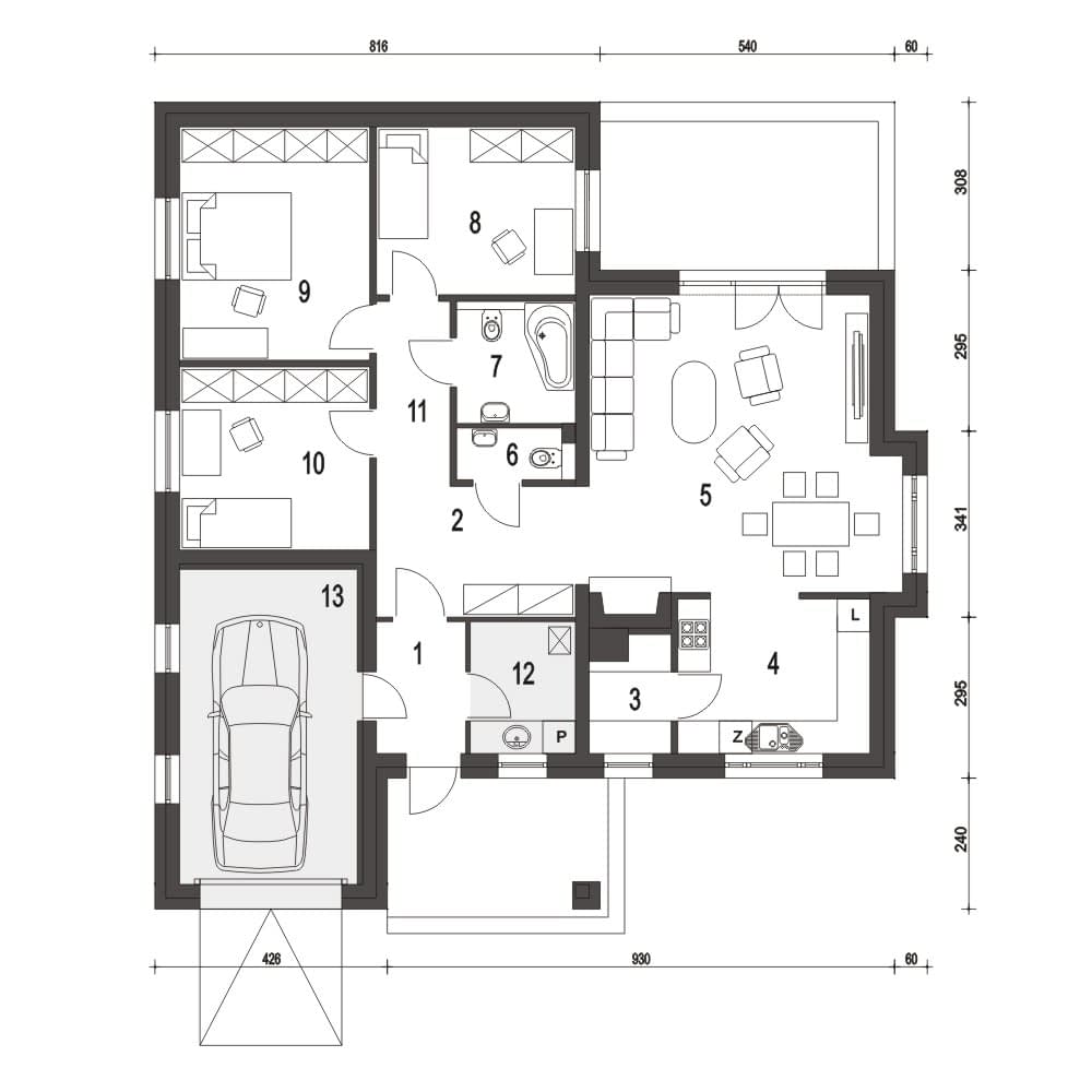 Radek III to klasyczny i elegancki projekt domu parterowego z wbudowanym garażem.