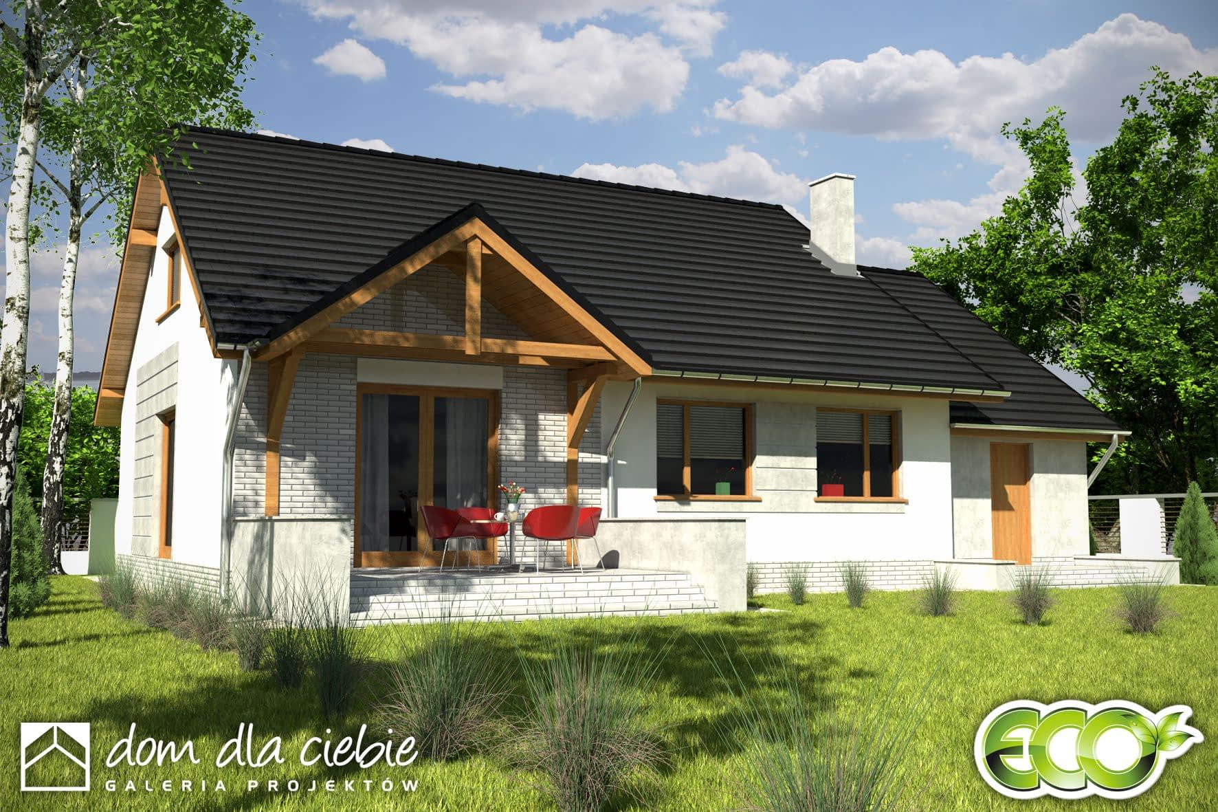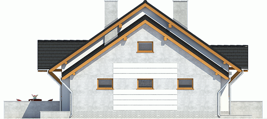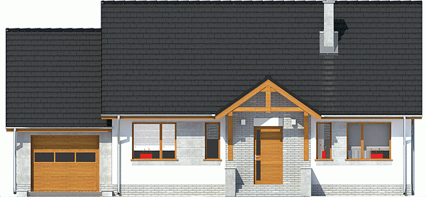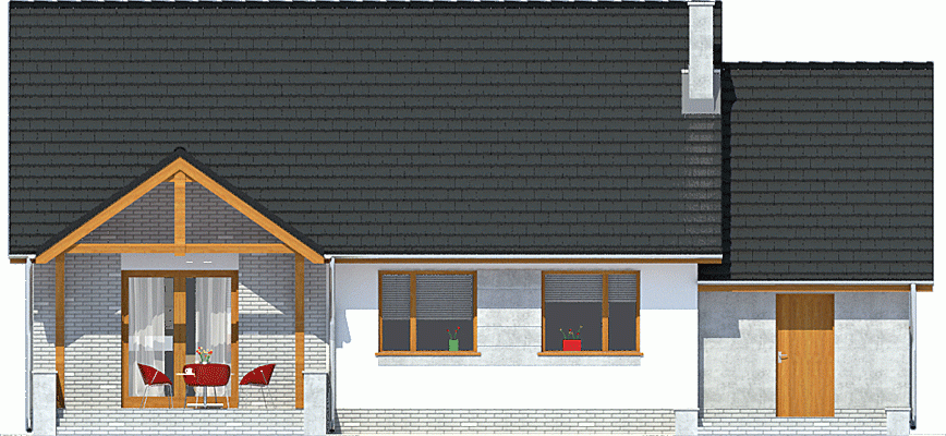 Projekt Rafi to propozycja niewielkiego domu parterowego z poddaszem do adaptacji na cele użytkowe. Dom został zaprojekowany z myślą o niezbyt szerokich działkach, dodatkowo szerokość można zmniejszyć o 1m po usunięciu okien w garażu i kotłowni. Współczesny, bardzo prosty dom dla 3-4-osobowej rodziny. Budynek na niewielkiej powierzchni parteru mieści wszystkie potrzebne pomieszczenia: 3 sypialnie, salon z wyjściem na częściowo zadaszony taras, kuchnię ze spiżarnią, pralnię z przejściem do garażu, WC, łazienkę, oraz kotłownię na paliwo stałe z wejściem zarówno od ogrodu jak i z domu poprzez garaż. W holu zlokalizowano schody na poddasze, które jest przygotowane do adaptacji na cele użytkowe. Dom ten dzięki zwartej bryle, dwuspadowym dachu oraz nieskomplikowanym rozwiązaniom konstrukcyjnym daje możliwość niedrogiej realizacji.