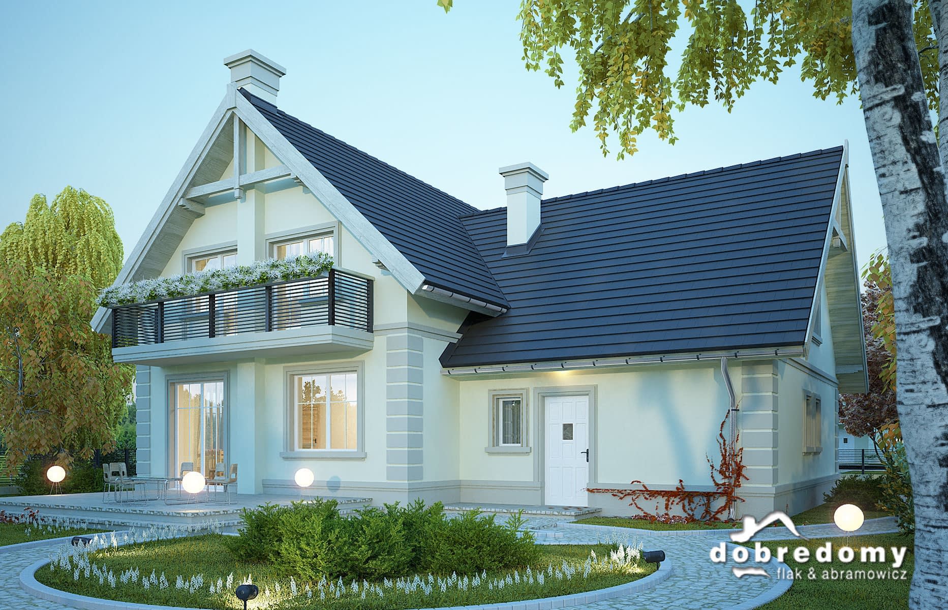 Dom z użytkowym poddaszem, dla 4-5-osobowej rodziny. Na parterze znajdują się: pokój dzienny połączony z jadalnią, łazienka, pokój gościnny/gabinet, oraz duże pomieszczenie gospodarcze dostępne z garażu dwustanowiskowego. Na poddaszu znajdują się trzy pokoje, duża łazienka oraz obszerny strych, który można zaadaptować na dodatkowy pokój. Projekt dostępny w wersji z garażem jednostanowiskowym - Realny. Projekt może być wykorzystany do zabudowy bliźniaczej.