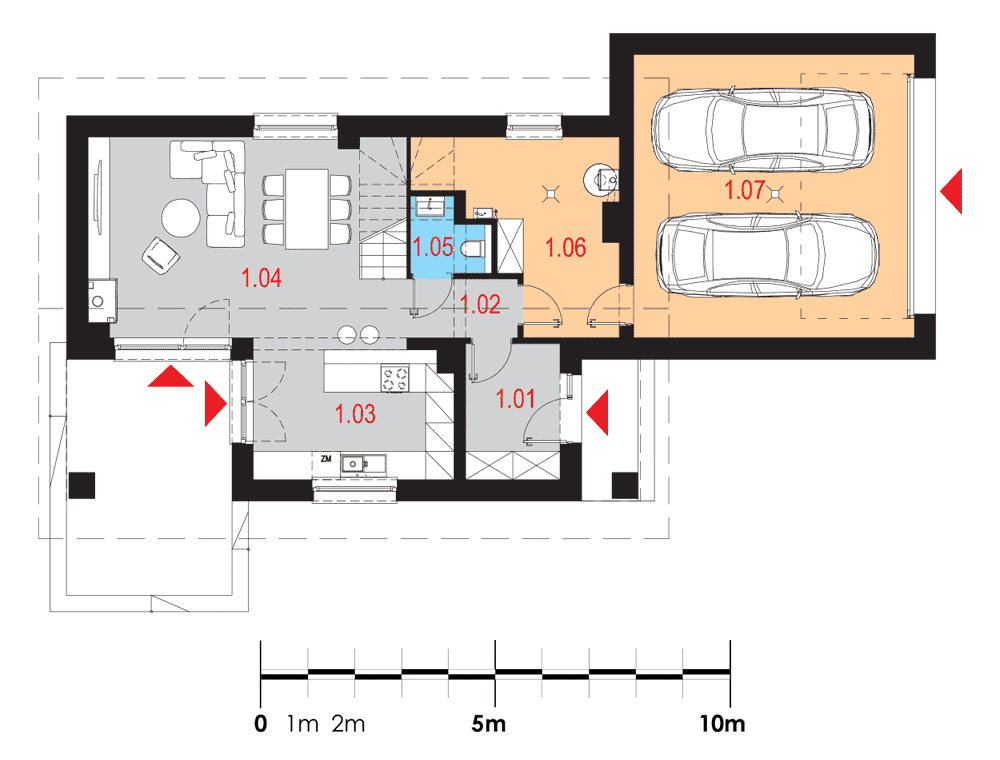 Pokój dzienny z jadalnią z wyjściem na taras, kuchnia z wyjściem na taras, trzy pokoje, łazienka, WC, garderoba, pralnia, pomieszczenie gospodarcze, garaż.