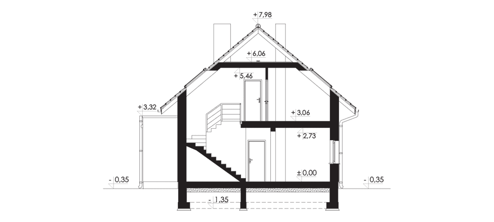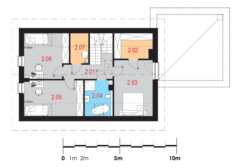 - Dach: dwuspadowy, konstrukcja drewniana, pokryty dachówką ceramiczną lub betonową mocowaną do łat.