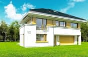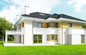 Prezentujemy Państwu projekt domu jednorodzinnego Rezydencja leśna. Jest to piętrowy, duży, komfortowy dom, przeznaczony dla rodziny 4-6cioosobowej. Projekt domu Rezydencja Leśna jest nowoczesny, ma zwartą bryłę, oraz funkcjonalne wnętrze. Został zaprojektowany w stylu piętrowej miejskiej willi. Główna bryła przekryta jest czterospadowymi dachami - elewacja frontowa jest szersza i zwęża się w kierunku ogrodu, dzięki czemu dom ma dwa oblicza: masywny reprezentacyjny przód i bardziej rozczłonkowany tył z załamaniami i dobudówkami, utrzymujący ludzką skalę. Elewacje zostały podzielone na poziome pasy - uzyskano w ten sposób lżejszą i ciekawszą sylwetkę budynku. Duże przeszklenia, narożne okna, wcięcia i wystające wykusze ozdabiają dom i nadają mu nowoczesny dynamiczny charakter. Wnętrze domu jest bardzo komfortowe i zawiera wszystko czego właściciele mogliby sobie zamarzyć. Na parterze szerokim przeszklonym wejściem z przedsionka wchodzimy do jednoprzestrzennego salonu połączonego z jadalnią i holem. Pokój dzienny łączy się pięknymi przeszkleniami z tarasem i ogrodem. Częściowo otwarta na jadalnię kuchnia z wyspą i spiżarnią usytuowana jest od frontu - z dużym oknem na wejście do domu. Na parterze znajdują się też: dwustanowiskowy garaż, kotłownia, oraz gabinet. Taras od strony ogrodu przykryty jest częściowo zadaszeniem. Piętro zawiera cztery duże sypialnie, w tym wygodny apartament rodziców, z własną łazienką, garderobą i tarasem ogrodowym. Dodatkowo są tutaj dwie łazienki i pomieszczenie pralni. Na samej górze domu zlokalizowany jest strych, który można wykorzystać na poddasze użytkowe i zrobić tam np. pomieszczenie rekreacyjne. Projekt domu Rezydencja Leśna zaprojektowano z wykorzystaniem energooszczędnym materiałów i technologii, dzięki czemu, mimo niemałej powierzchni, jego koszty utrzymania nie będą duże.