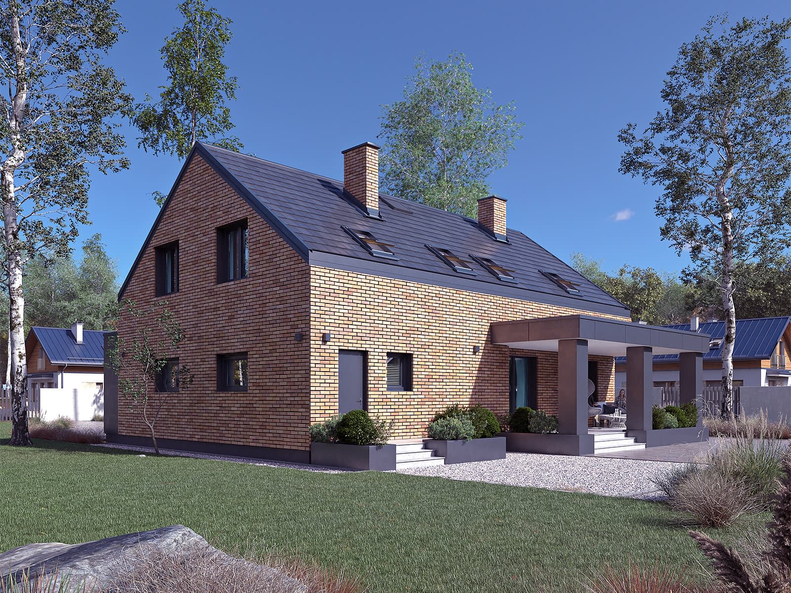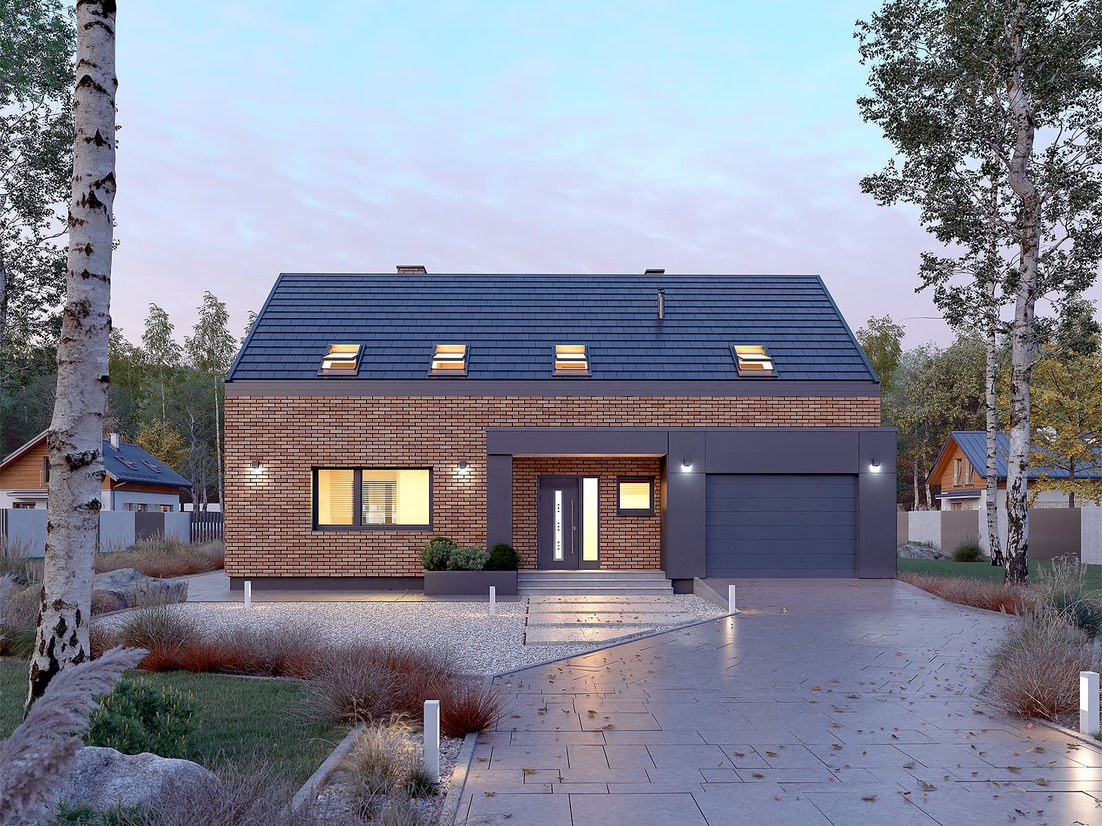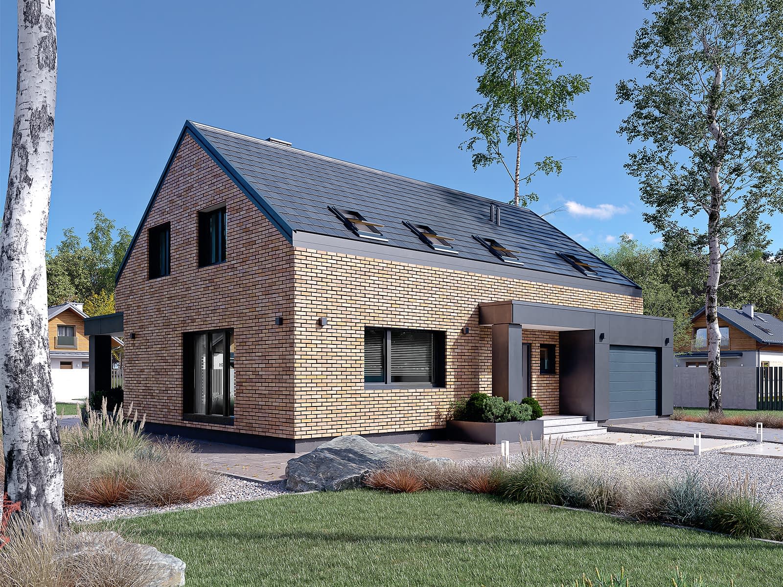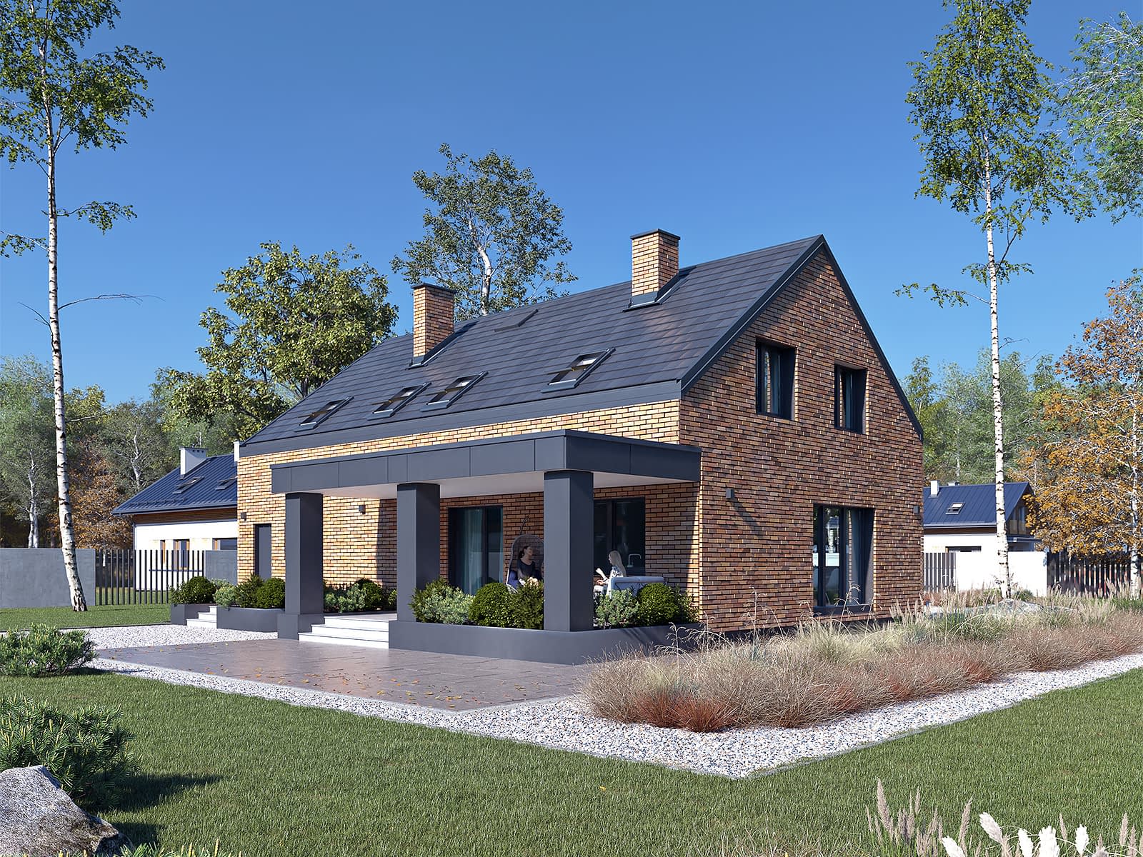 Rio jest domem zaprojektowanym do potrzeb 4-5-osobowej rodziny. Charakterystyczną cechą tego projektu zwarta i prosta bryła oraz nowoczesne rozwiązania materiałowe. Dom zaliczany jest do serii projektów domów energooszczędnych. Budynek jest przykryty dwuspadowym dachem o kącie nachylenia połaci równym 35 stopni. Program funkcjonalny rozkłada się na dwie kondygnacje. Jasna fasada z jasną szalówką drewnianą bardzo dobrze komponuje się z grafitowym dachem, a grafitowa cegła na części garażowej nadaje bryle charakteru.Konstrukcja