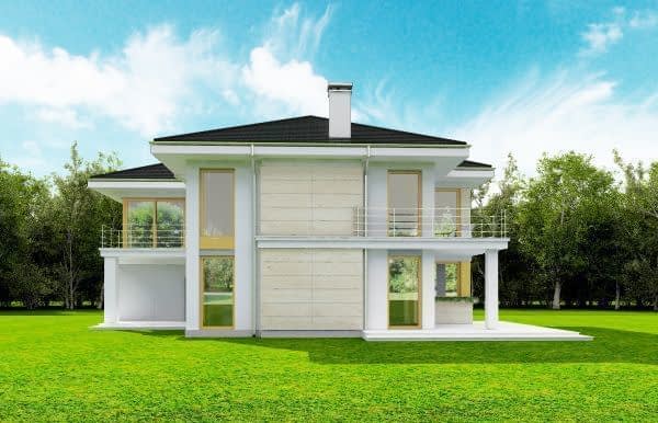 Projekt domu Riwiera 2 to kolejna wersja popularnego projektu Riwiera. Jest to nieco mniejszy wariant domu, z zachowanymi podobnymi rozwiązaniami wnętrz i wyglądu zewnętrznego. Budynek jest piętrowy, z wbudowanym w bryłę garażem. Projekt domu Riwiera 2 przeznaczona jest dla cztero-sześcioosobowej rodziny. Budynek zaprojektowano w stylu miejskiej nowoczesnej willi, z łagodnymi dachami i dużymi przeszkleniami. Elewacje podzielone zostały na poziome pasy, a różne okładziny i kolory urozmaicają powierzchnie ścian. Znakiem firmowym „Riwiery 2” są piękne duże okna. Część z nich sięga od podłogi do sufitu, dzięki czemu z wnętrza dziennego domownicy będą mieli świetny widok na otaczający ogród. Środek domu podzielono na część dzienną na parterze, oraz sypialnie na piętrze. Do domu wchodzimy przez obszerną sień, z przejściem do garażu i pomieszczenia gospodarczego. Następnie przechodzimy do holu, połączonego z pokojem dziennym i kuchnią, które razem tworzą dużą otwartą przestrzeń. Z holu dostępne są także : schody na piętro, niewielka łazienka i dodatkowy pokój ( gabinet lub sypialnia gościnna ). Nad jadalnią zostawiono otwarty sufit na antresolę piętra, z oknami o wysokości dwóch kondygnacji, z widokiem na ogródek. Reprezentacyjna ściana kominkowo-telewizyjna będzie ozdobą całego domu. Z salonu wychodzimy na częściowo zadaszony taras i do ogrodu. Na piętrze przewidziano cztery sypialnie, w tym apartament rodziców w osobnej części domu, z własną łazienką i garderobą. Sypialnie dziecięce mają dodatkową łazienkę - z holu. Istnieje możliwość zamknięcia pustki nad salonem i zaprojektowania piątego pokoju na piętrze. Projekt domu Riwiera 2 to przemyślany, bardzo funkcjonalny, energooszczędny dom jednorodzinny. Jego koszt budowy wypada korzystnie w stosunku do uzyskanej powierzchni ( pozbawionej skosów ), oraz komfortu i wygody mieszkania. Pracownia posiada wersję odbicia lustrzanego oraz inne propozycje tej serii: bazowa (Projekt domu Riwiera), poszerzona o mniejszej głębokości (Projekt domu Rwiera 3) pomniejszona ze zmienionym układem wewnętrznym (Projekt domu Riwiera 4) oraz zmodyfikowana i ulepszona wersja bazowego projektu (Projekt domu Riwiera 5). Zapraszamy!