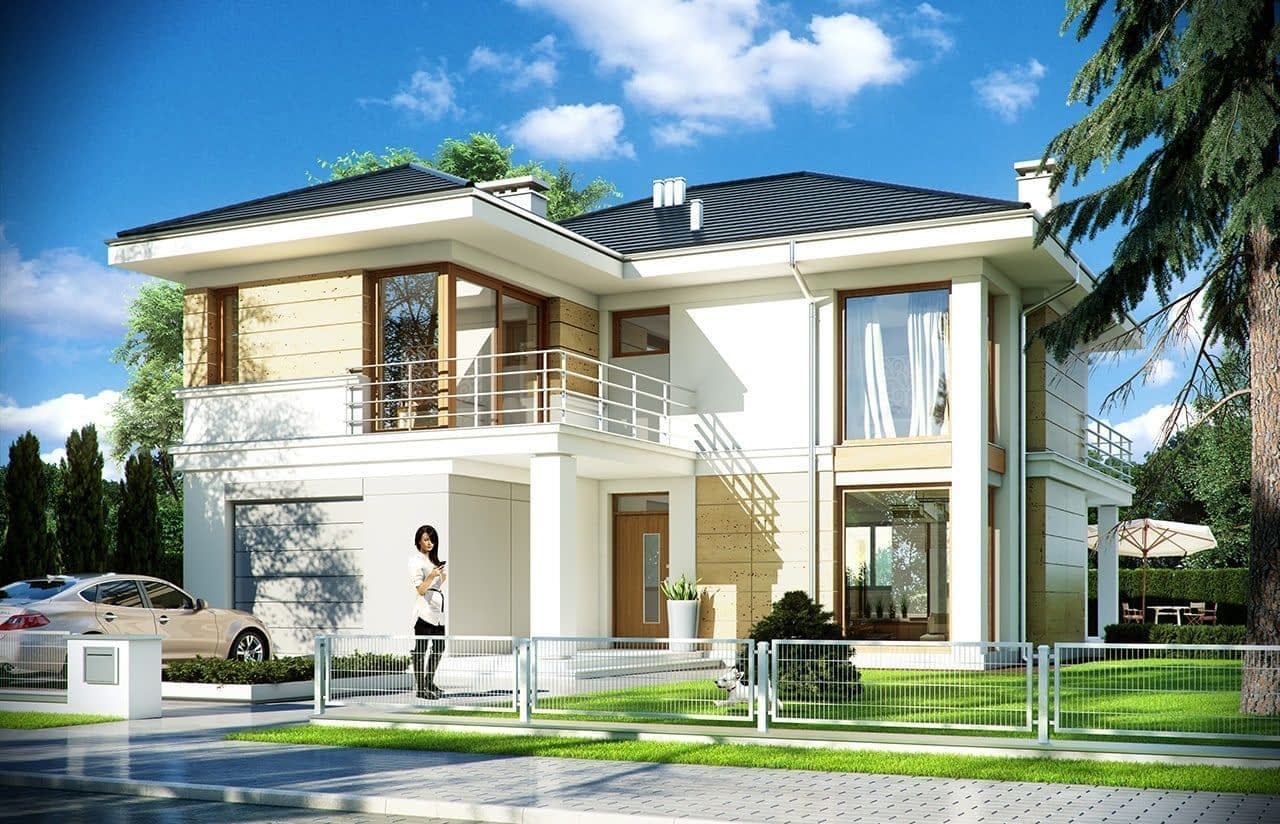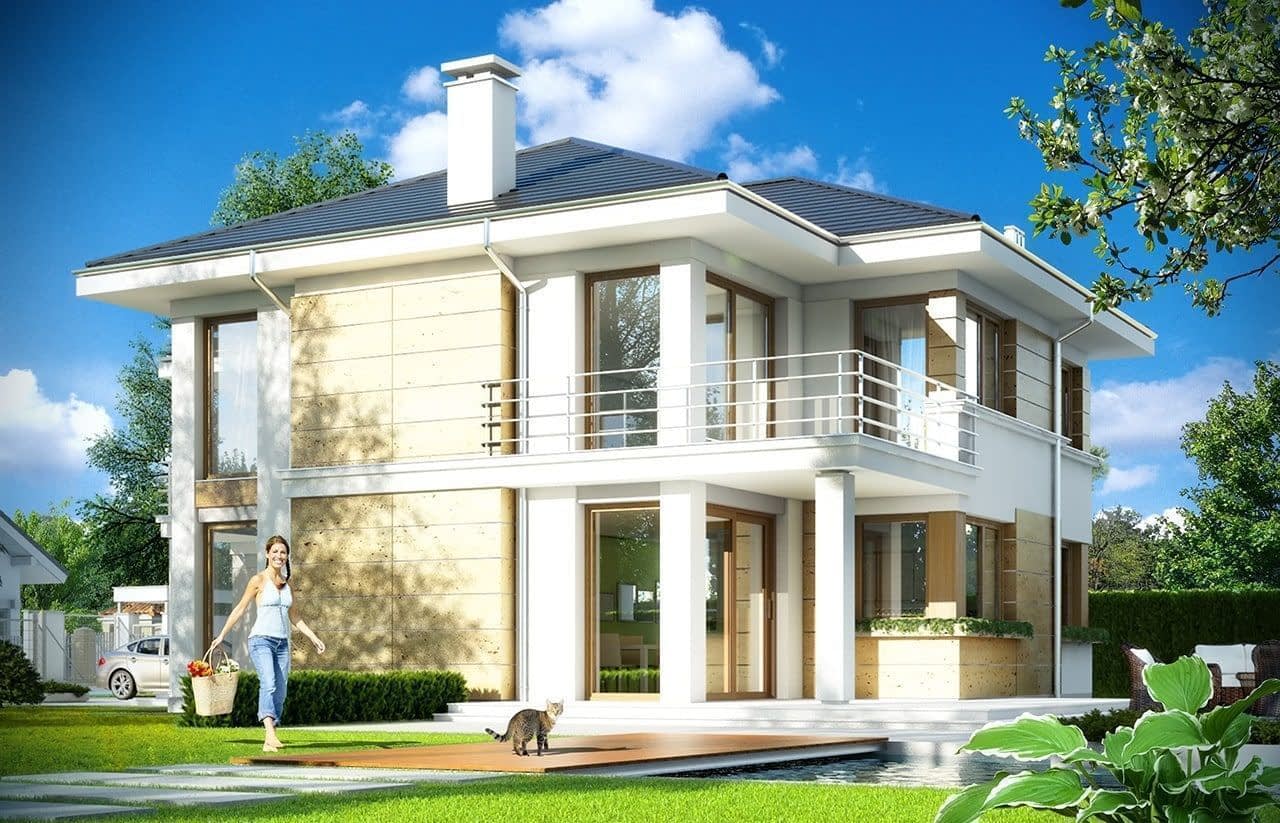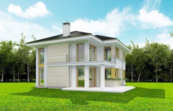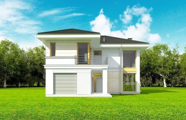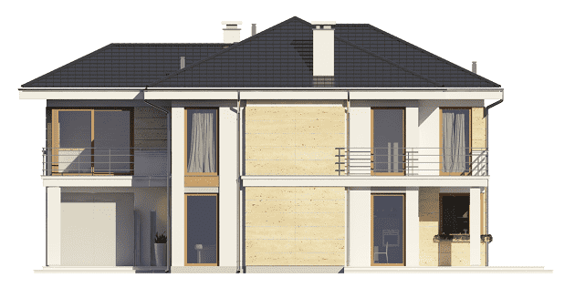 Projekt domu Riwiera 2 to kolejna wersja popularnego projektu Riwiera. Jest to nieco mniejszy wariant domu, z zachowanymi podobnymi rozwiązaniami wnętrz i wyglądu zewnętrznego. Budynek jest piętrowy, z wbudowanym w bryłę garażem. Projekt domu Riwiera 2 przeznaczona jest dla cztero-sześcioosobowej rodziny. Budynek zaprojektowano w stylu miejskiej nowoczesnej willi, z łagodnymi dachami i dużymi przeszkleniami. Elewacje podzielone zostały na poziome pasy, a różne okładziny i kolory urozmaicają powierzchnie ścian. Znakiem firmowym „Riwiery 2” są piękne duże okna. Część z nich sięga od podłogi do sufitu, dzięki czemu z wnętrza dziennego domownicy będą mieli świetny widok na otaczający ogród. Środek domu podzielono na część dzienną na parterze, oraz sypialnie na piętrze. Do domu wchodzimy przez obszerną sień, z przejściem do garażu i pomieszczenia gospodarczego. Następnie przechodzimy do holu, połączonego z pokojem dziennym i kuchnią, które razem tworzą dużą otwartą przestrzeń. Z holu dostępne są także : schody na piętro, niewielka łazienka i dodatkowy pokój ( gabinet lub sypialnia gościnna ). Nad jadalnią zostawiono otwarty sufit na antresolę piętra, z oknami o wysokości dwóch kondygnacji, z widokiem na ogródek. Reprezentacyjna ściana kominkowo-telewizyjna będzie ozdobą całego domu. Z salonu wychodzimy na częściowo zadaszony taras i do ogrodu. Na piętrze przewidziano cztery sypialnie, w tym apartament rodziców w osobnej części domu, z własną łazienką i garderobą. Sypialnie dziecięce mają dodatkową łazienkę - z holu. Istnieje możliwość zamknięcia pustki nad salonem i zaprojektowania piątego pokoju na piętrze. Projekt domu Riwiera 2 to przemyślany, bardzo funkcjonalny, energooszczędny dom jednorodzinny. Jego koszt budowy wypada korzystnie w stosunku do uzyskanej powierzchni ( pozbawionej skosów ), oraz komfortu i wygody mieszkania. Pracownia posiada wersję odbicia lustrzanego oraz inne propozycje tej serii: bazowa (Projekt domu Riwiera), poszerzona o mniejszej głębokości (Projekt domu Rwiera 3) pomniejszona ze zmienionym układem wewnętrznym (Projekt domu Riwiera 4) oraz zmodyfikowana i ulepszona wersja bazowego projektu (Projekt domu Riwiera 5). Zapraszamy!