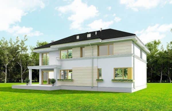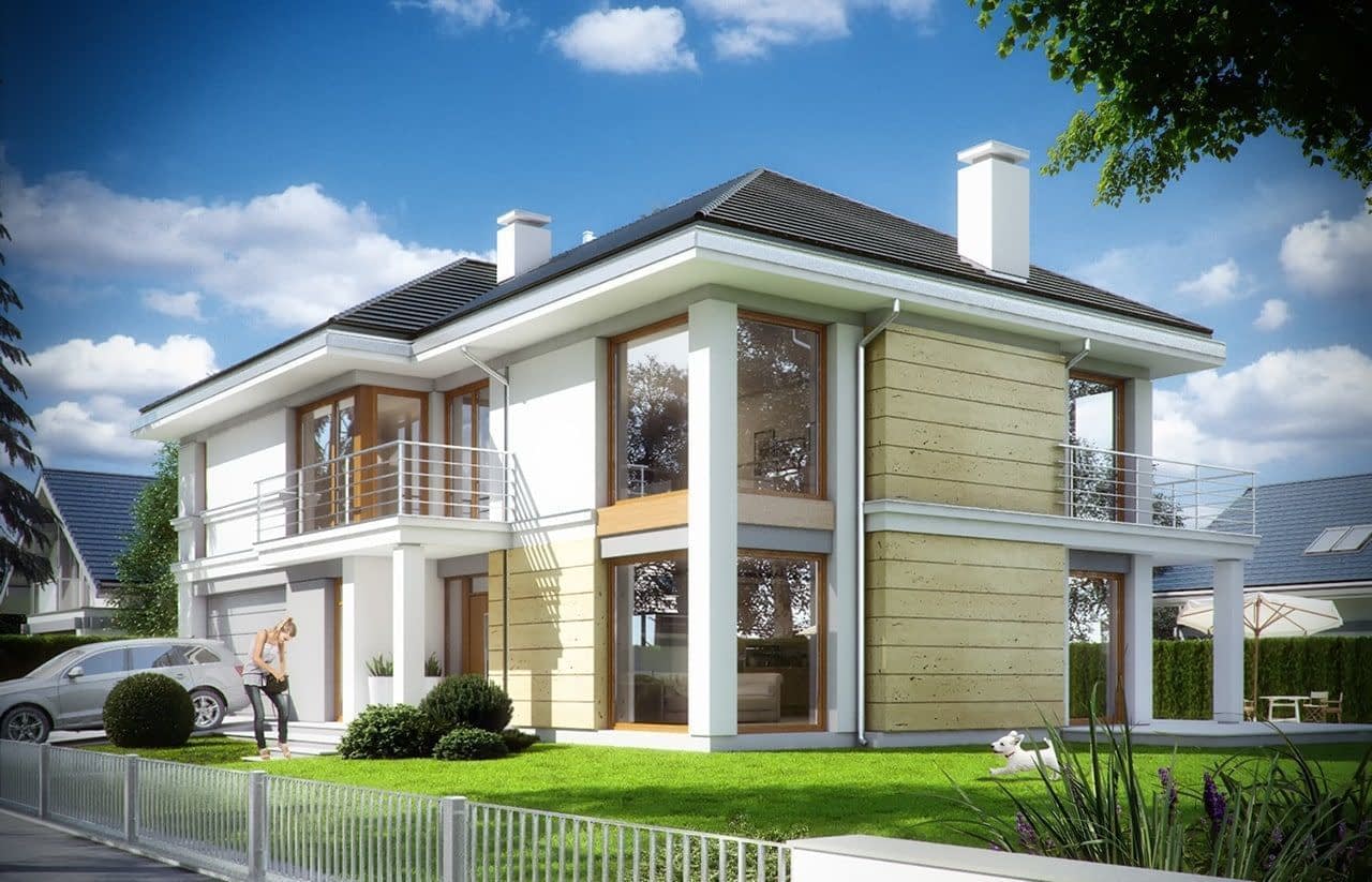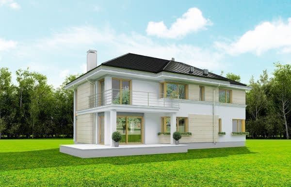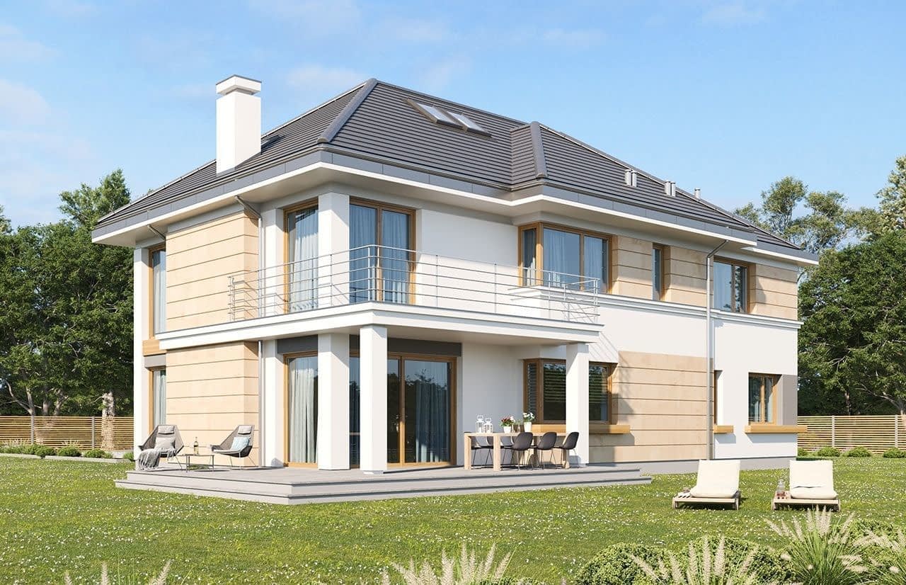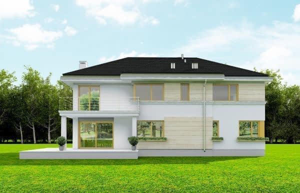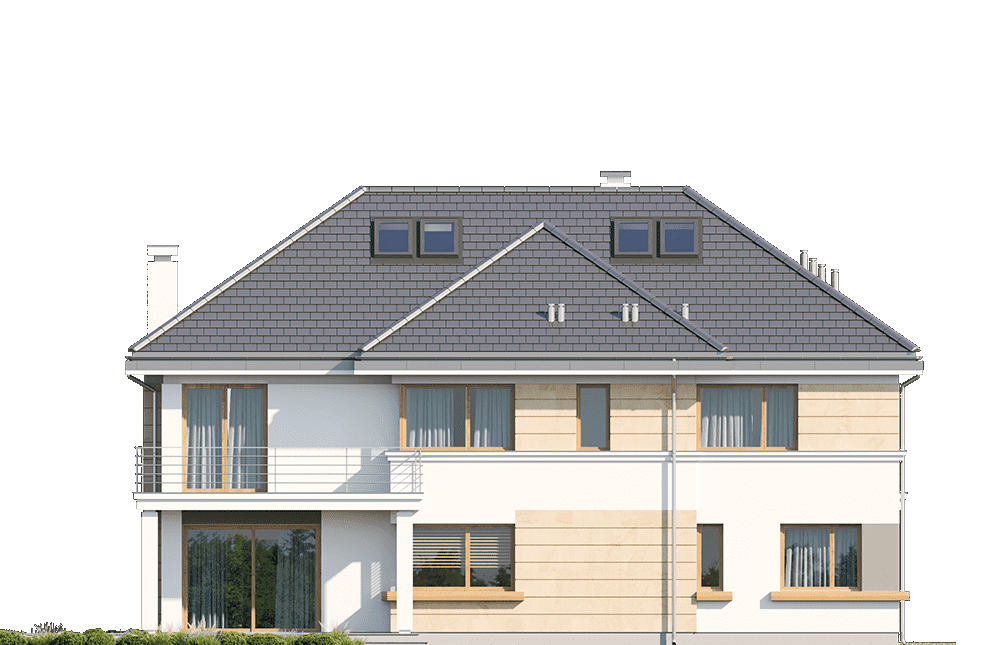 Projekt domu Riwiera 3 to kolejna wersja popularnego projektu „Riwiera” - tym razem wariant domu poszerzonego, o mniejszej głębokości, nadającego się naszerszą i płytszą działkę, z ogródkiem w tylnym bocznym narożniku. Projekt domu Riwiera 3 to wygodny komfortowy dom dla cztero-sześcioosobowej rodziny. Na parterze mieszczą się pomieszczenia dzienne, jak salon, hol z reprezentacyjnymi ozdobnymi schodami, czy kuchnia, oraz część gospodarcza z garażem i kotłownią i dodatkowy pokój - gabinet lub sypialnia gościnna. Piętro mieści cztery pokoje, z oddzielnym apartamentem rodziców z łazienką i dużą garderobą. Obie kondygnacje łączy otwarta pustka nad salonem i antresola obszernego holu na piętrze. Dzięki temu wnętrze domu jest wyjątkowo atrakcyjne i wydaje się jeszcze większe. Wygląd zewnętrzny budynku to nowoczesna bryła przekryta wielospadowym dachem, z elewacją rozdzieloną poziomymi pasami gzymsów, urozmaiconą dużymi przeszkleniami okien. Architektura domu jest jednocześnie nowoczesna i bezpretensjonalna. Budynek szczególnie przypadnie do gustu osobom, które mają trudną działkę - z drogą od nasłonecznionej strony. Osobom, które z jednej strony muszą wpuścić możliwie dużo światła do salonu i pokoi od południa, z drugiej strony nie chcą mieć tarasu od frontu domu, tylko ogródek za domem lub z jego boku. Projekt domu Riwiera 3 dostępny jest również w odbiciu lustrzanym. Zapraszamy do zapoznania się z pełną ofertą pracowni MG Projekt tej serii: bazowa (Projekt domu Riwiera), pomniejszonej (Projekt domu Riwiera 2), pomniejszonej ze zmienionym układem wewnętrznym (Projekt domu Riwiera 4) oraz zmodyfikowana i ulepszona wersja bazowego projektu (Projekt domu Riwiera 5). Zapraszamy!
