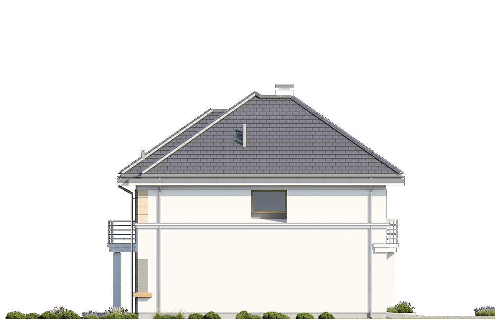 Wariant projektu ze zmienionym stropem nad piętrem z drewnianego na płytę żelbetową. Podniesienie kąta dachu na 35st. Adaptacja strychu na pomieszczenie użytkowe – przedłużona klatka schodowa.