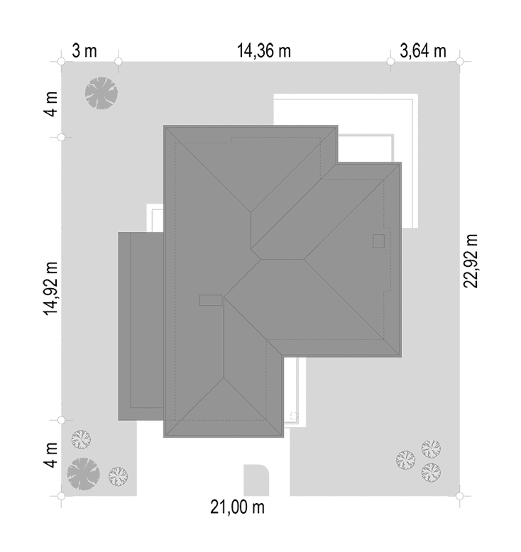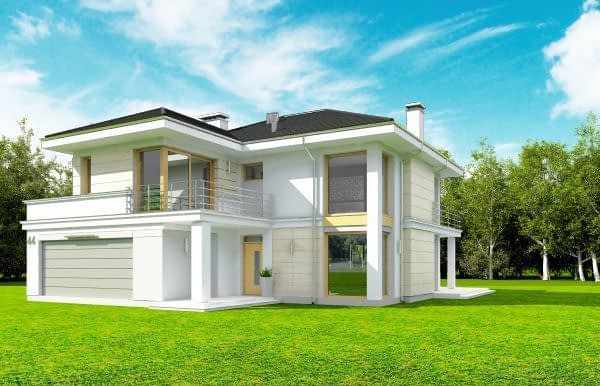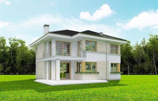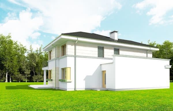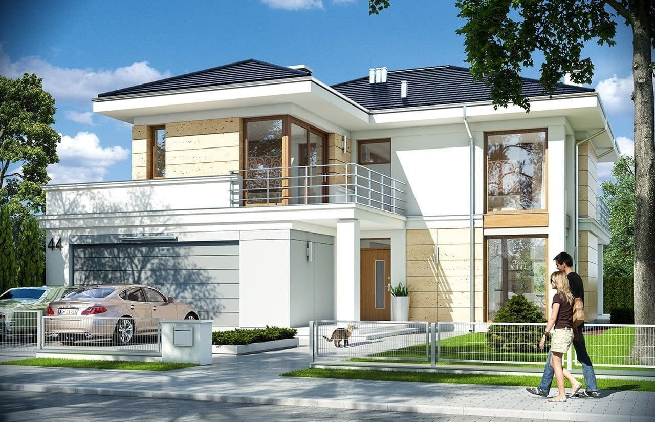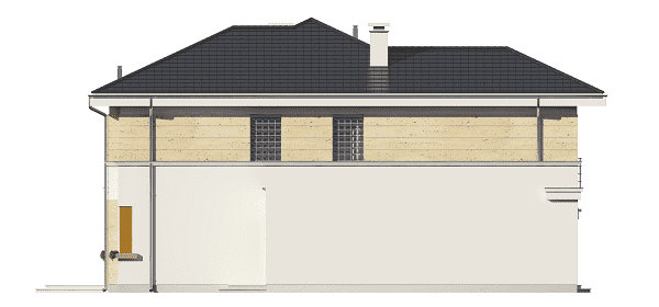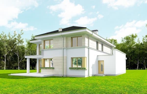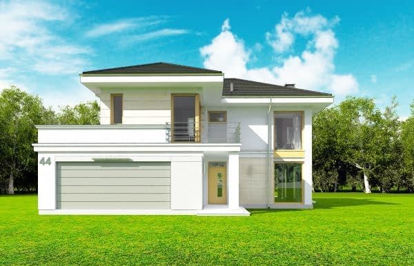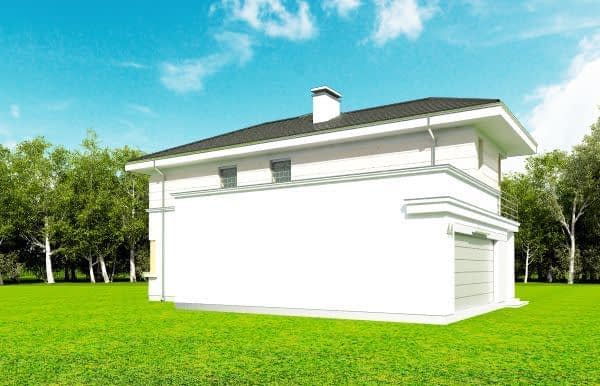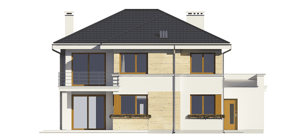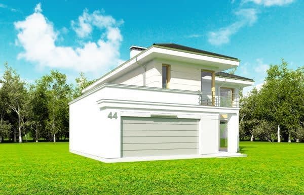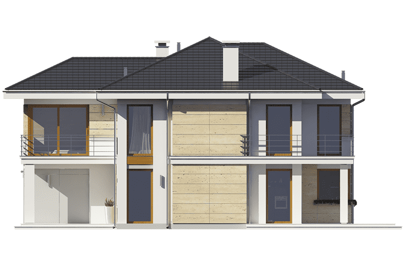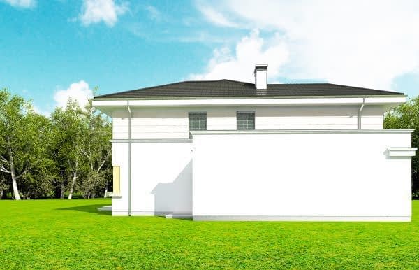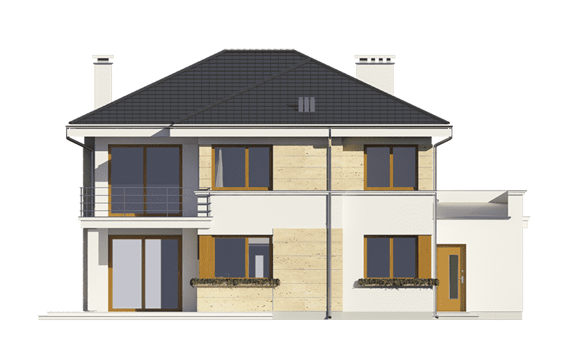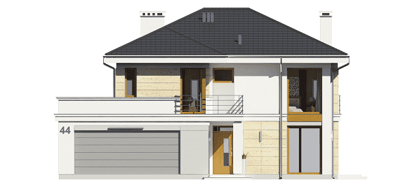 Projekt domu Riwiera 4 to wariant popularnego projektu Riwiera 2 - tym razem z dwustanowiskowym garażem. Projekt domu Riwiera 4 to piętrowy budynek, przewidziany dla 4-5 osobowej rodziny, przekryty łagodnym wielospadowym dachem, z wbudowanym - częściowo wystającym poza obrys bryły domu - podwójnym garażem. Budynek zaprojektowano w stylu miejskiej nowoczesnej willi, z łagodnymi dachami i dużymi przeszkleniami. Elewacje podzielone zostały na poziome pasy, a ściany urozmaicone różno materiałowymi okładzinami. Charakterystycznym elementem domu są piękne duże okna , których część sięga od podłogi do sufitu, zapewniając dużo światła i piękne widoki na ogród z części dziennej. Wnętrze domu podzielono na część dzienną na parterze, oraz sypialnie na piętrze. Parter to otwarta duża przestrzeń dzienna, z salonem, holem i kuchnią, z wydzieloną częściowo jadalnią. Otwarty hol stanowi centrum domu. Z niego dostajemy się reprezentacyjnymi schodami na górę, lub obszernym przedsionkiem na zewnątrz , albo do części gospodarczej domu - do kotłowni i garażu. Na parterze znajduje się dodatkowy pokój (gabinet lub sypialnia gościnna), oraz wc z natryskiem. Nad jadalnią zostawiono otwarty sufit na antresolę piętra, z oknami o wysokości dwóch kondygnacji, z widokiem na ogródek. Reprezentacyjna ściana kominkowo-telewizyjna będzie ozdobą całego domu. Z salonu wychodzimy na częściowo zadaszony taras i do ogrodu. Na piętrze przewidziano cztery sypialnie, w tym apartament rodziców w osobnej części domu, z własną łazienką i garderobą. Sypialnie dziecięce mają dodatkową łazienkę - z holu. Istnieje możliwość zamknięcia pustki nad salonem i zaprojektowania piątego pokoju na piętrze. Projekt domu Riwiera 4 to przemyślany, bardzo funkcjonalny, energooszczędny dom jednorodzinny. Jego koszt budowy wypada korzystnie w stosunku do uzyskanej powierzchni (pozbawionej skosów), oraz komfortu i wygody mieszkania. Dostępna jest opcja w projekcie ze stropem monolitycznym nad parterem i piętrem, wersja w odbiciu lustrzanym projektu oraz inne wersje: bazowa (projekt Riwiera), wersja najmniejsza (projekt domu Riwiera 2) wersja poszerzona (projekt domu Riwiera 3) oraz zmodyfikowana i ulepszona wersja bazowego projektu (Projekt domu Riwiera 5). Zapraszamy!
