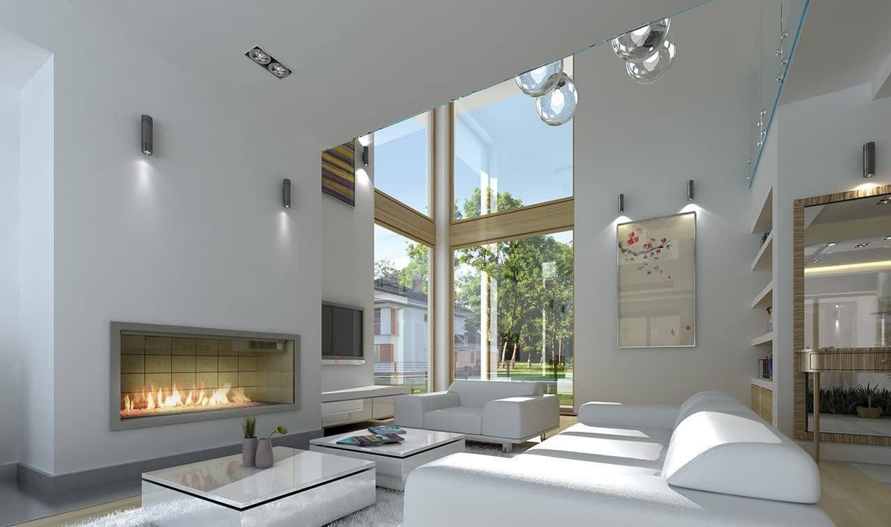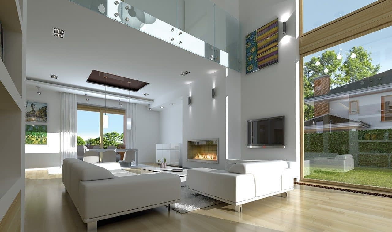 Projekt domu Riwiera 5 to kolejny z popularnych projektów z serii Riwiera, czyli zmodyfikowana i ulepszona wersja bazowego projektu. Projekt domu Riwiera 5 to dom bez podpiwniczenia, z dachem o wyższym kącie nachylenia, oraz z wariantowym wnętrzem piętra : z pustką i antresolą nad salonem, oraz bez pustki. To piętrowy dom, zbudowany na planie litery „T”, z wystającą nieco do przodu częścią garażową. Przykryty jest wielospadowym dachem krytym dachówką. Nowoczesna bryła ozdobiona została dużymi oknami, kamiennymi okładzinami ścian, boniowaniami, oraz gzymsami oddzielającymi parter i piętro. Szczególnie widowiskowe są narożne okna części dziennej, połączone z oknami piętra. Architektura domu jest nowoczesna, a jednocześnie powściągliwa, stonowana i nie przesadzona. Dzięki temu budynek nie traci na swojej przytulności. Dzięki układowi wnętrza i odpowiedniemu rozmieszczeniu okien budynek może być postawiony także na działce z wjazdem od południa. Wnętrze : na parterze zaprojektowano otwartą przestrzeń dzienną - w wersji z pustką z otwarciem sufitu nad salonem. Kuchnia z wyspą oddzielona od holu szklaną ścianą stanowi ozdobę salonu. Pokój dzienny, jadalnia i hol tworzą razem piękne wnętrze. Na parterze mamy też dodatkowy pokój ( gabinet lub sypialnię gościnną ), wc, kotłownię i dwustanowiskowy garaż. Na piętrze, w zależności od wersji ( z pustką lub bez ) mamy trzy lub cztery sypialnie, 2 łazienki, garderoby i pralnię. Sypialnia rodziców to oddzielny apartament z łazienką i dwiema garderobami. W wersji z pustką nad salonem mamy piękną antresolę będącą kontynuacją salonu. Projekt domu Riwiera 5 - wizualizacja frontu - odbicie lustrzane to atrakcyjny, nowoczesny dom, o energooszczędnych rozwiązaniach. Projekt można bardzo łatwo dostosować do standardu NF40. Pracownia posiada wersję odbicia lustrzanego oraz inne propozycje tej serii: bazowa (Projekt domu Riwiera), pomniejszonej (Projekt domu Riwiera 2), poszerzonej, o mniejszej głębokości (Projekt domu Rwiera 3), pomniejszonej ze zmienionym układem wewnętrznym (Projekt domu Riwiera 4). Zapraszamy!