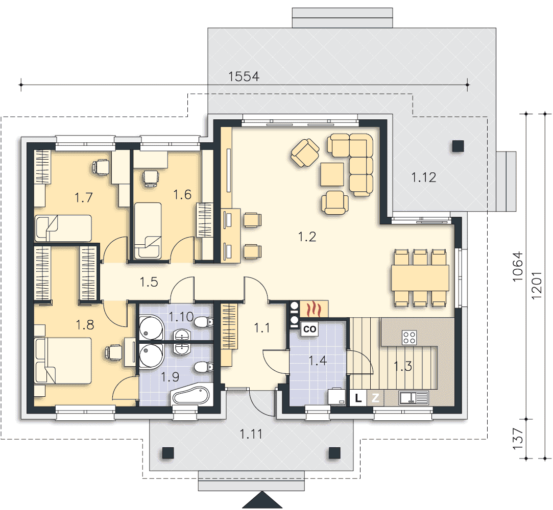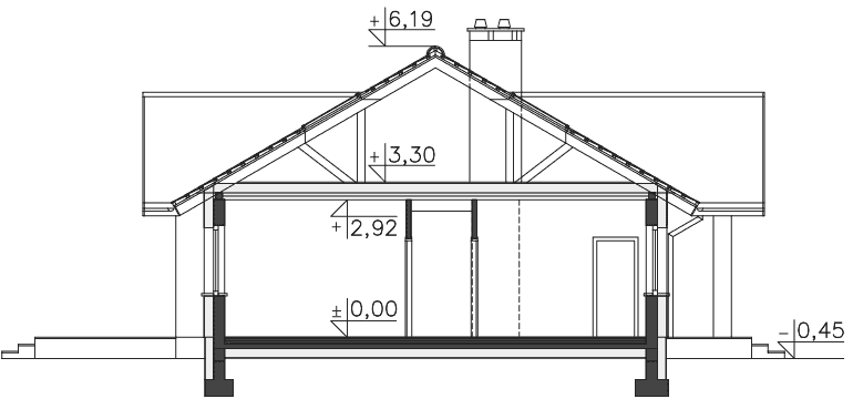 Wygodny dom energooszczędny, parterowy, o bardzo dobrze rozplanowanej funkcji, z wyraźnym podziałem na strefę wspólną oraz część prywatną. W części wspólnej znajduje się duży, jasny salon, kącik jadalny, zlokalizowany przy dużych przeszkleniach i ustawna kuchnia z sąsiadującą pralnią z kotłownią. Atutem domu są trzy sypialnie, w tym jedna z własną łazienką i garderobą. Jest także dodatkowa, wspólna łazienka. Dom jest niedrogi w realizacji, a przy tym w kosztach ogrzewania. W projekcie przewidziano ogrzewanie kotłem na gaz. Możliwa jest zmiana ogrzewania na pompę ciepła.
