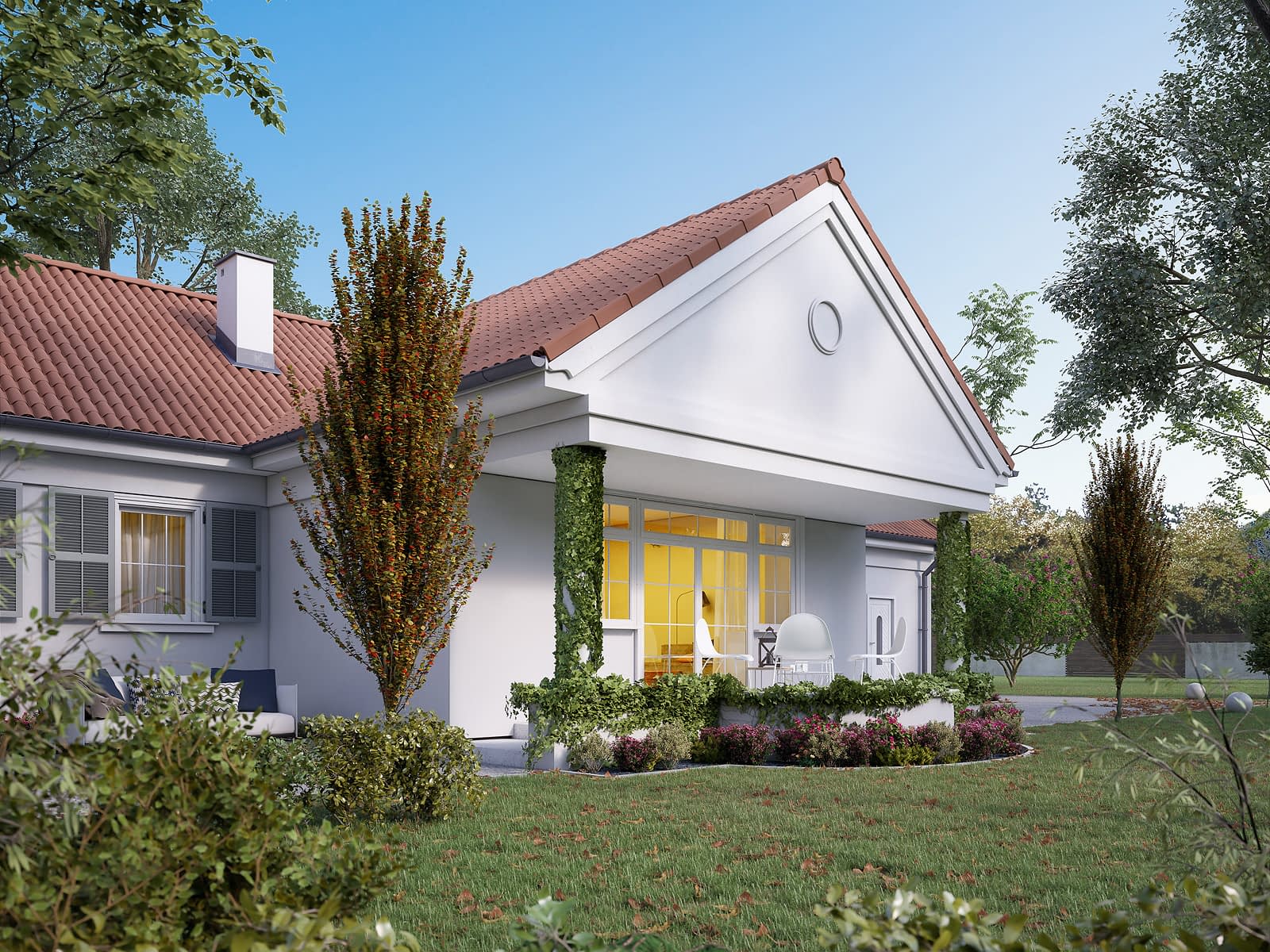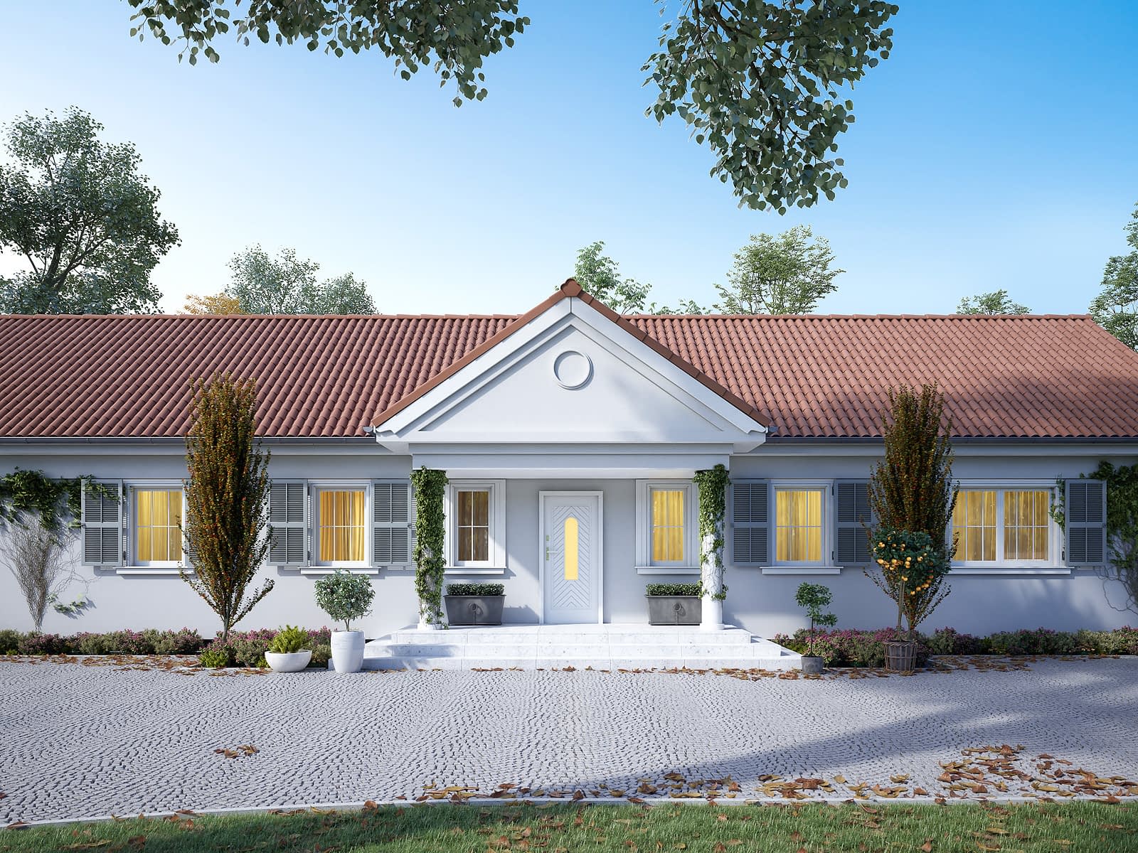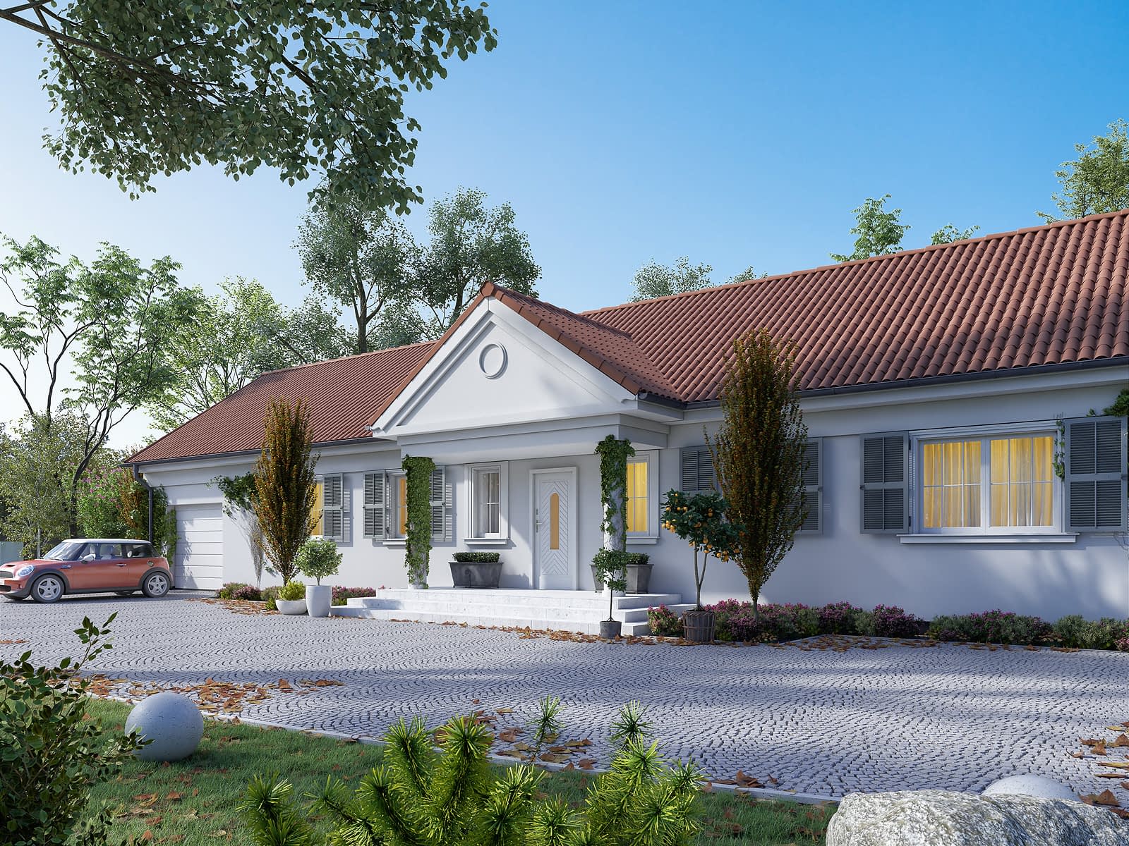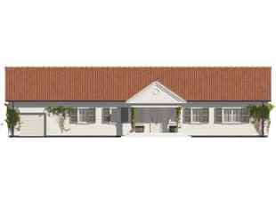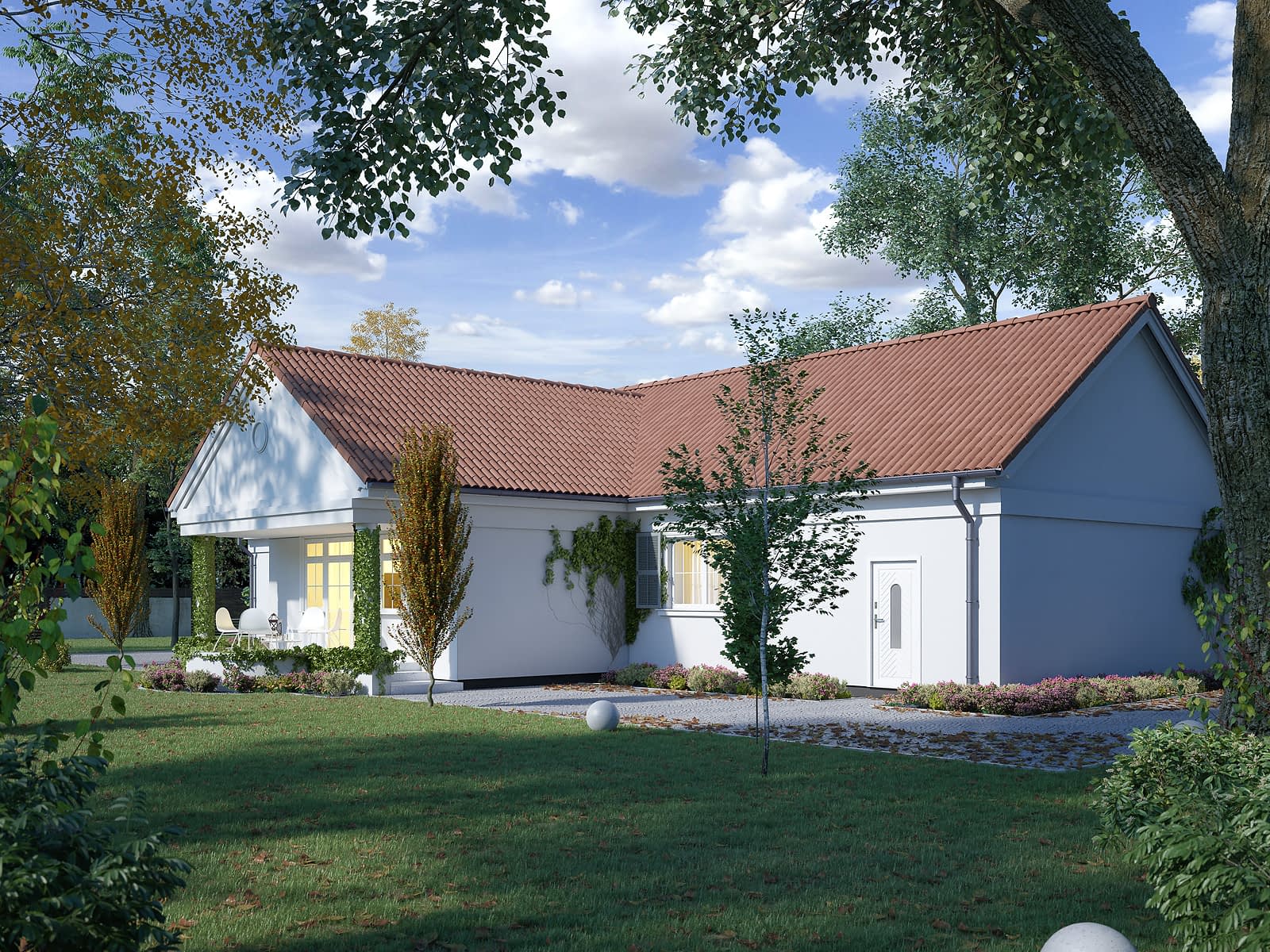 Rozłogi 2 to projekt domu parterowego, który stylem wykończenia nawiązuje do stylu dworskiego. Wejście frontowe zostało wyeksponowane zadaszeniem w postaci trójkątnej lukarny wspartej na dwóch kolumnach. W podobny sposób zostało zadaszone wyjście na taras od strony ogrodu. Układ funkcjonalny został zaprojektowany wzdłuż poziomej osi budynku. Centralne miejsce w domu zajmuje strefa dzienna, na którą składa się przestronny salon z jadalnią oraz otwartą kuchnią z przylegającą do niej spiżarnią. Strefa nocna została podzielona na dwie części, znajdujące się po przeciwległych stronach salonu. W jednej z nich zaprojektowano apartament gospodarzy z prywatną łazienką oraz garderobą. W drugiej części budynku znajdują się dwie sypialnie, każda z własną garderobą, gabinet, łazienka oraz pralnia. W projekcie przewidziano również jednostanowiskowy garaż z przejściem do pomieszczenia gospodarczego z oddzielnym wejściem od strony ogrodu.Konstrukcja