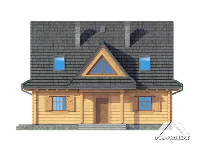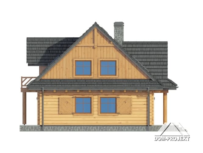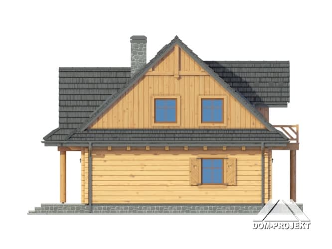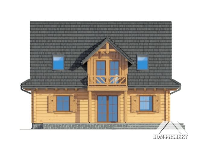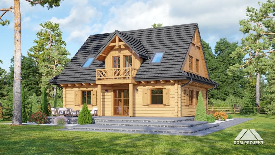 Dom z bali. Duży salon z aneksem kuchennym, kominkiem i wyjściem na taras. Pokój, wc, komunikacja, wiatrołap i kotłownia. Na poddaszu trzy pokoje, łazienka, garderoba, komunikacja i balkon. Zwarta bryła budynku i dach dwuspadowy sprzyjają szybkiej i taniej budowie i niskim kosztom eksploatacji.Rzuty