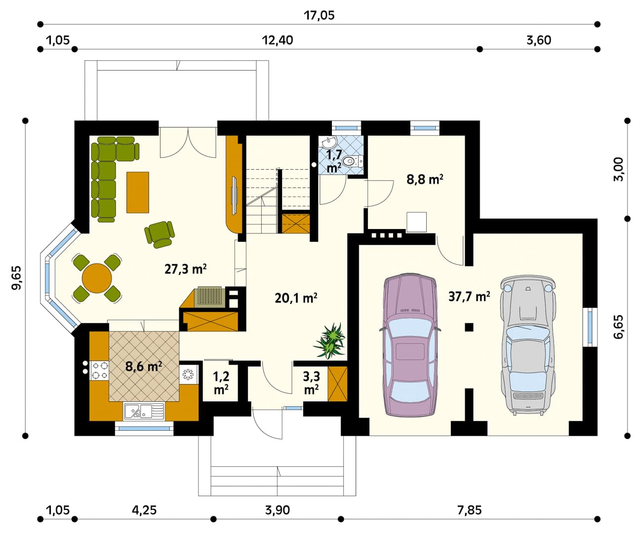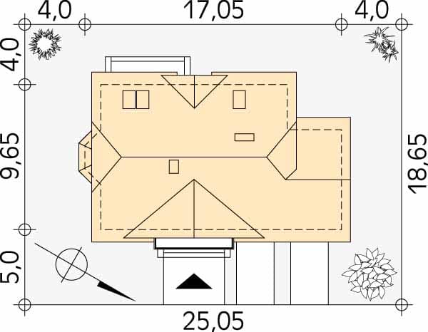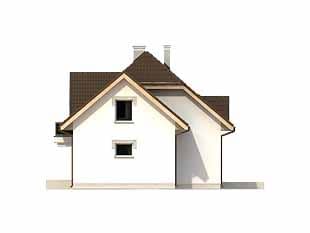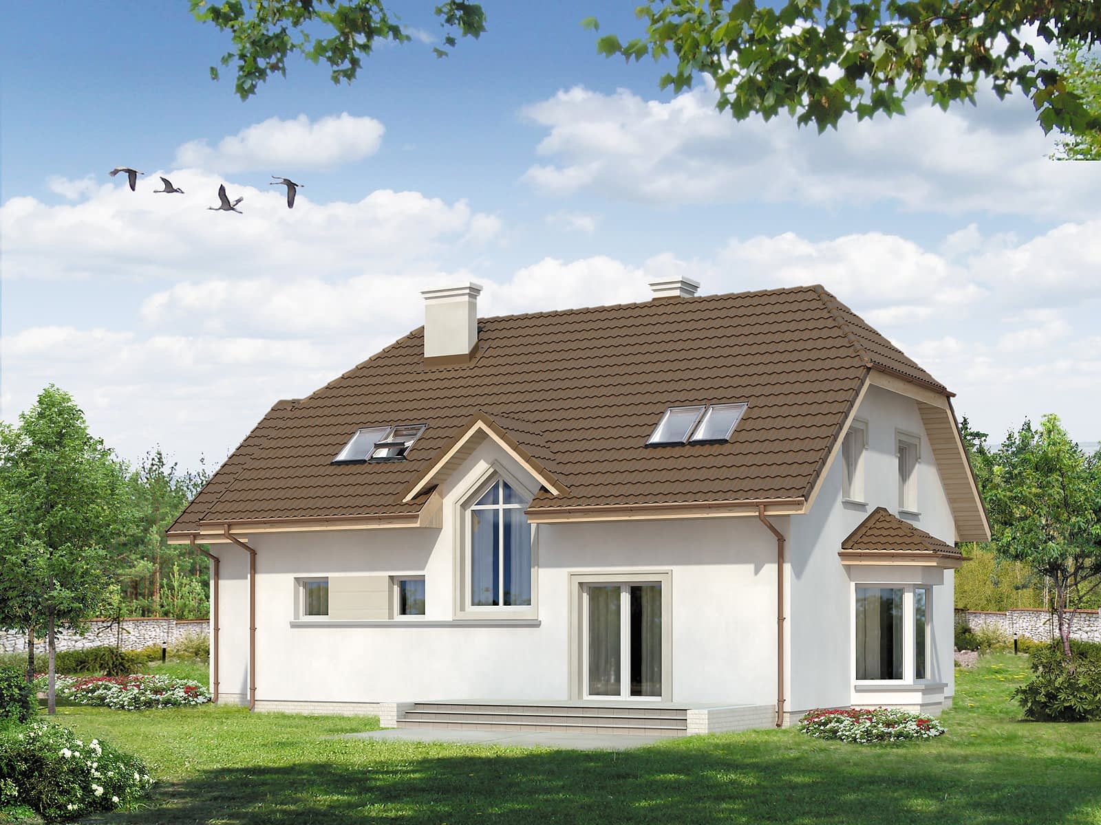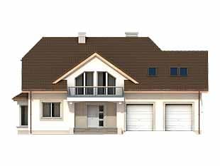 Dom jednorodzinny, parterowy z użytkowym poddaszem. Przeznaczony dla 4-osobowej rodziny. Prosty układ funkcjonalny z wyraźnym podziałem na strefę dzienną i nocną. Zaprojektowano szereg pomieszczeń pomocniczych. Dwustanowiskowy garaż. Możliwość podpiwniczenia.Konstrukcja