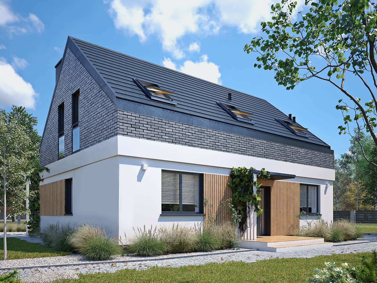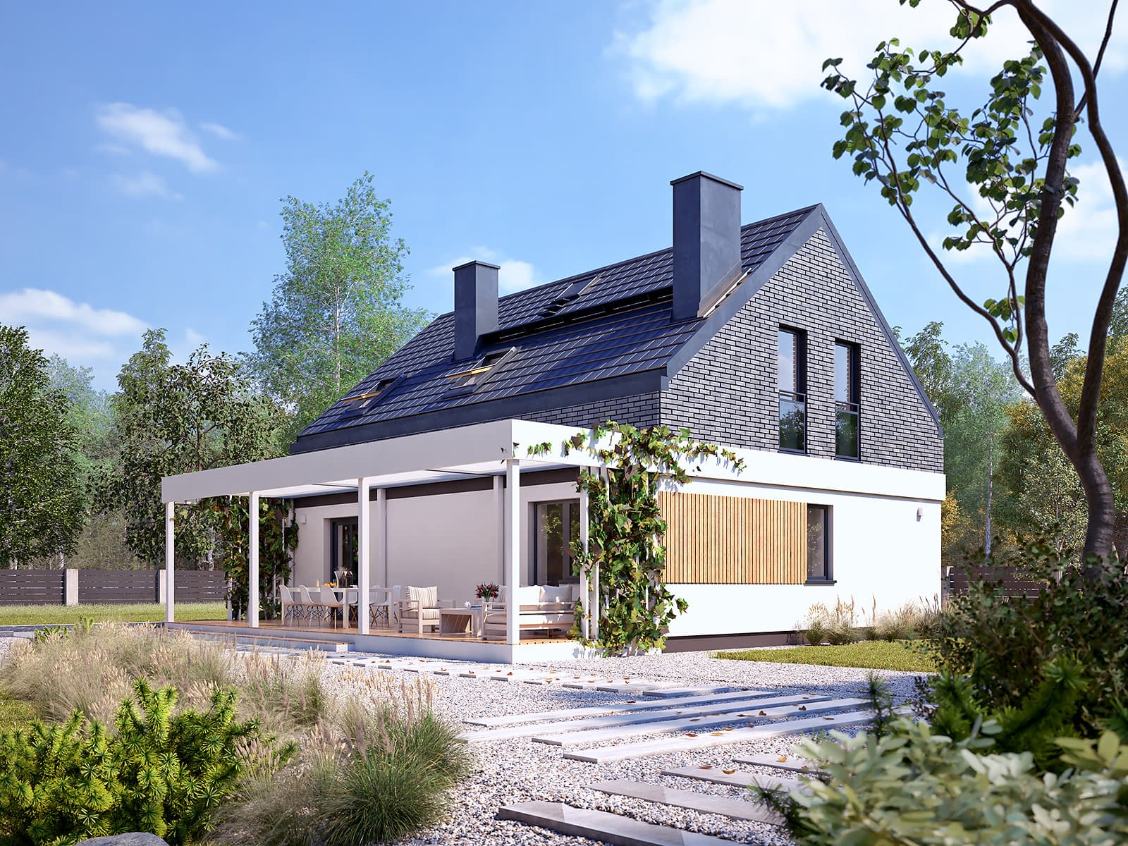 Ściany: 2-warstwowe - pustak ceramiczny Porotherm 25 Profi + styropian, Stropy: żelbetowe, wylewane, Dach: dachówka ceramiczna Koramic Orea 9,Rzuty