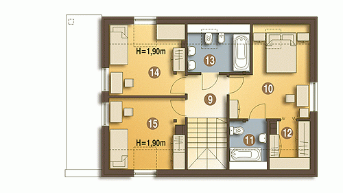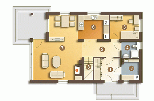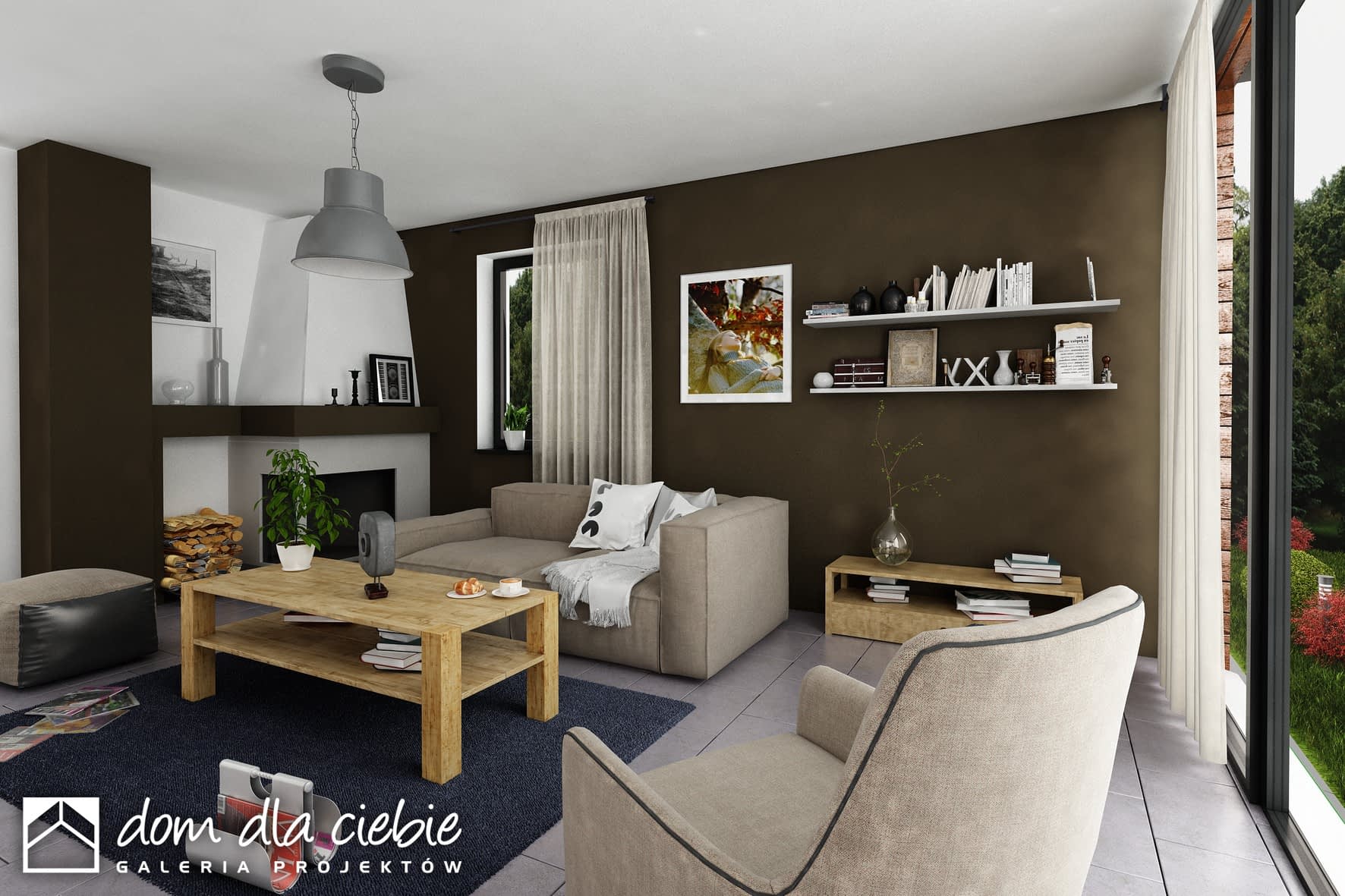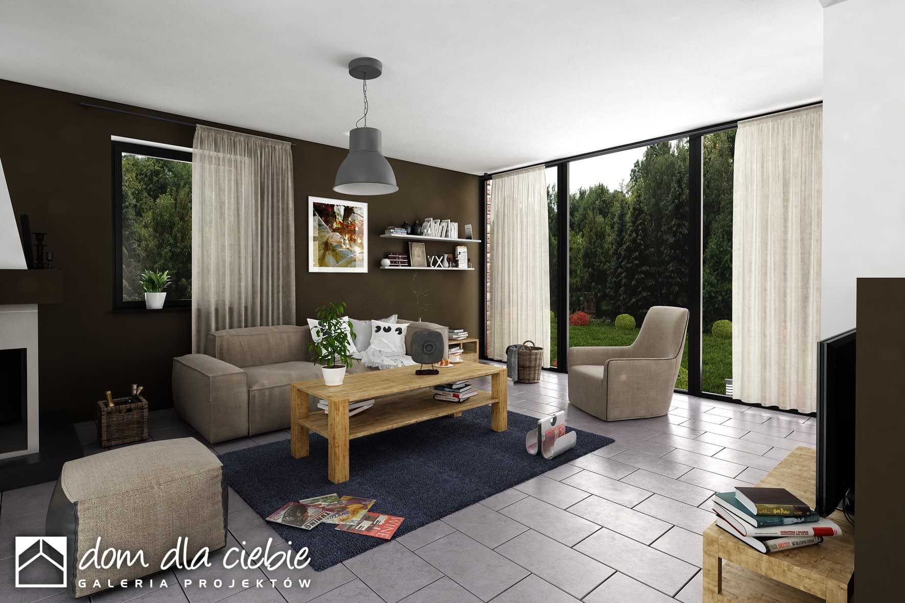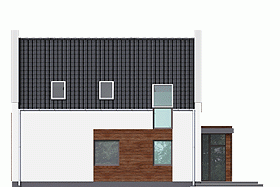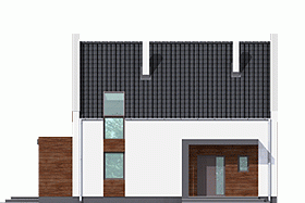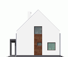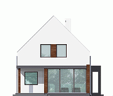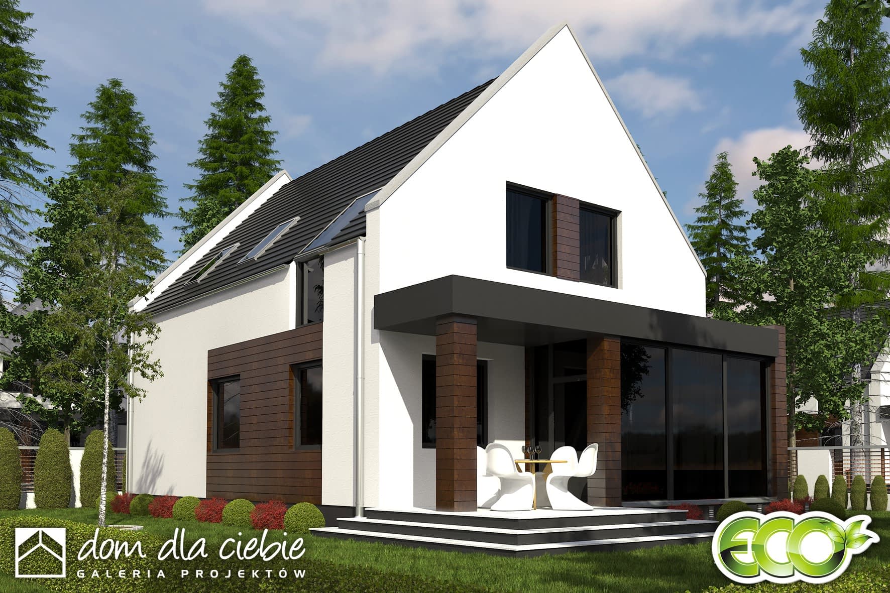 Nowoczesny projekt małego domu jednorodzinnego z charakterystycznym przeszkleniem w salonie. Ten mały dom przeznaczony jest dla 4-5 osobowej rodziny. Przestronny i dobrze oświetlony salon z kominkiem i wyjściem na zadaszony taras daje poczucie komfortu. Przewidziano dodatkowy pokój/gabinet oraz łazienkę na parterze. Znajduje się tam również kuchnia i pomieszczenie gospodarcze z piecem C.O.. Na poddaszu zaprojektowano 3 sypialnie. W sypialniach dzieci zastosowano okna połaciowe zespolone z oknem w ścianie kolankowej - poprawiają one pole widzenia i zwiększają doświetlenie pokoju. Sypialnia rodziców wyposażona jest we własną łazienkę i garderobę.