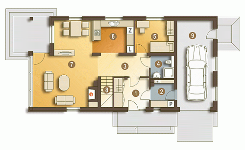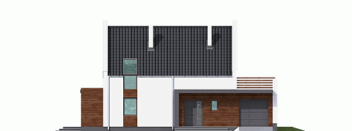 Nowoczesny dom jednorodzinny z charakterystycznym przeszkleniem w salonie. Dom przeznaczony jest dla 4-5 osobowej rodziny. Przestronny i dobrze oświetlony salon z kominkiem i wyjściem na zadaszony taras daje poczucie komfortu. Przewidziano dodatkowy pokój/gabinet oraz łazienkę na parterze. Znajduje się tam również kuchnia i pomieszczenie gospodarcze z piecem co. Na poddaszu zaprojektowano 3 sypialnie. W sypialniach dzieci zastosowano okna połaciowe zespolone z oknem w ścianie kolankowej - poprawiają one pole widzenia i zwiększają doświetlenie pokoju. Sypialnia rodziców wyposażona jest we własną łazienkę i garderobę. Obszerny garaż pozwala na przechowywanie sprzętu ogrodniczego lub rowerów. Na garażu zaprojektowano taras dostępny z pokoju rodziców.