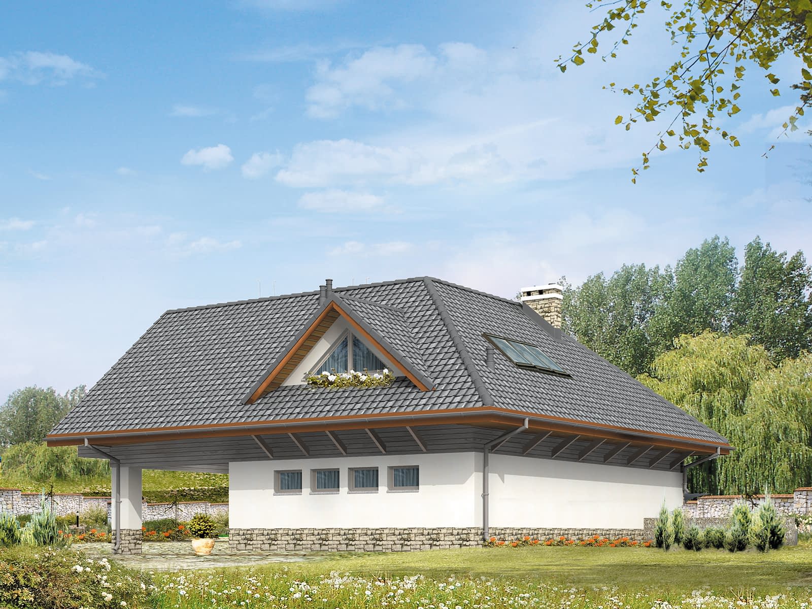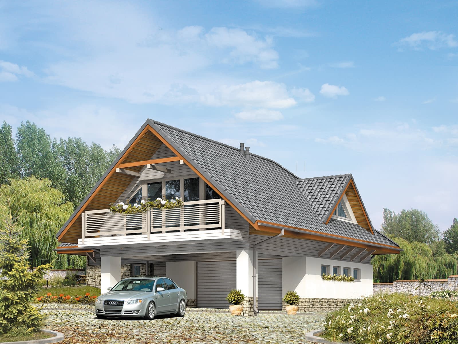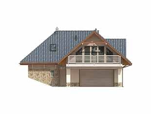 Dom letniskowy, parterowy z poddaszem użytkowym. Przestronny garaż daje możliwość parkowania dwóch samochodów lub samochodu i łodzi. Duże przeszklenie ściany sypialni prowadzące na zadaszony balkon zapewnią komfortowy wypoczynek w niepogodę. Kształt bryły budynku, użycie naturalnych materiałów i dobór detalu architektonicznego pozwolą na wkomponowanie domu w każdy krajobraz.Konstrukcja