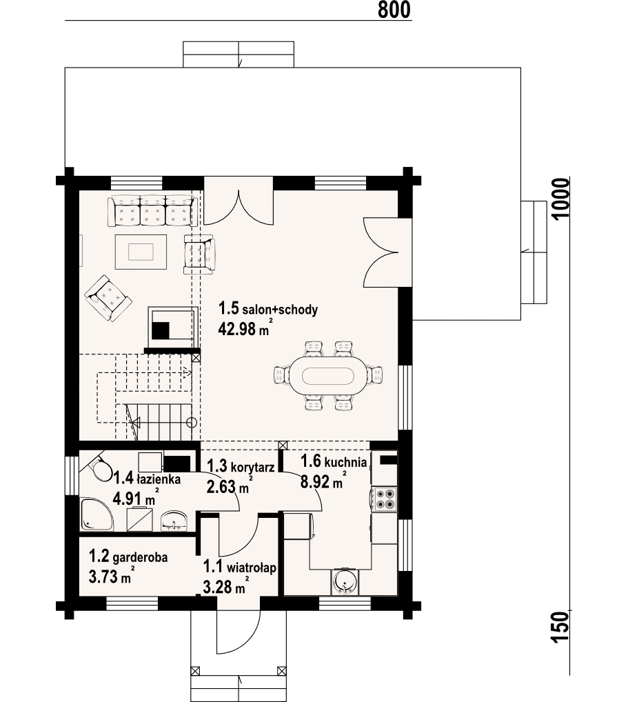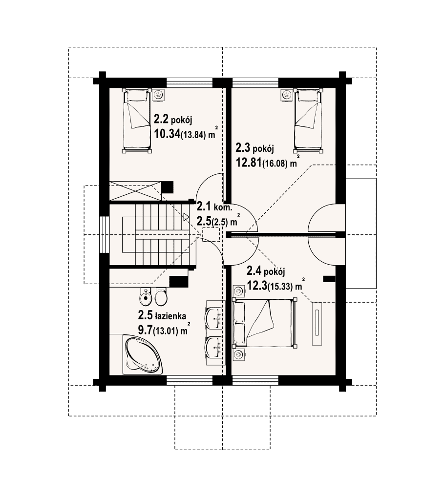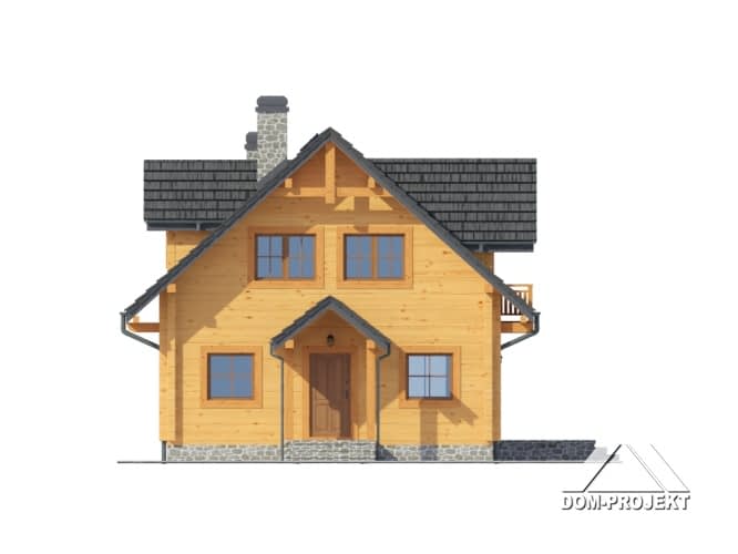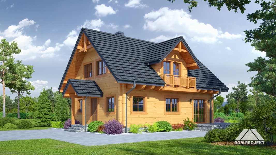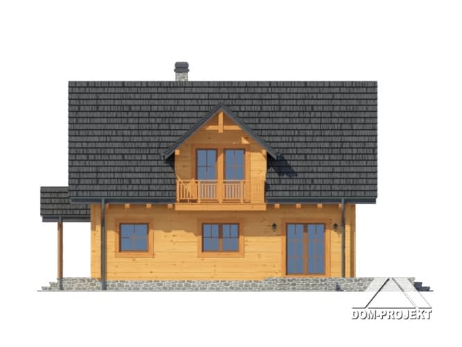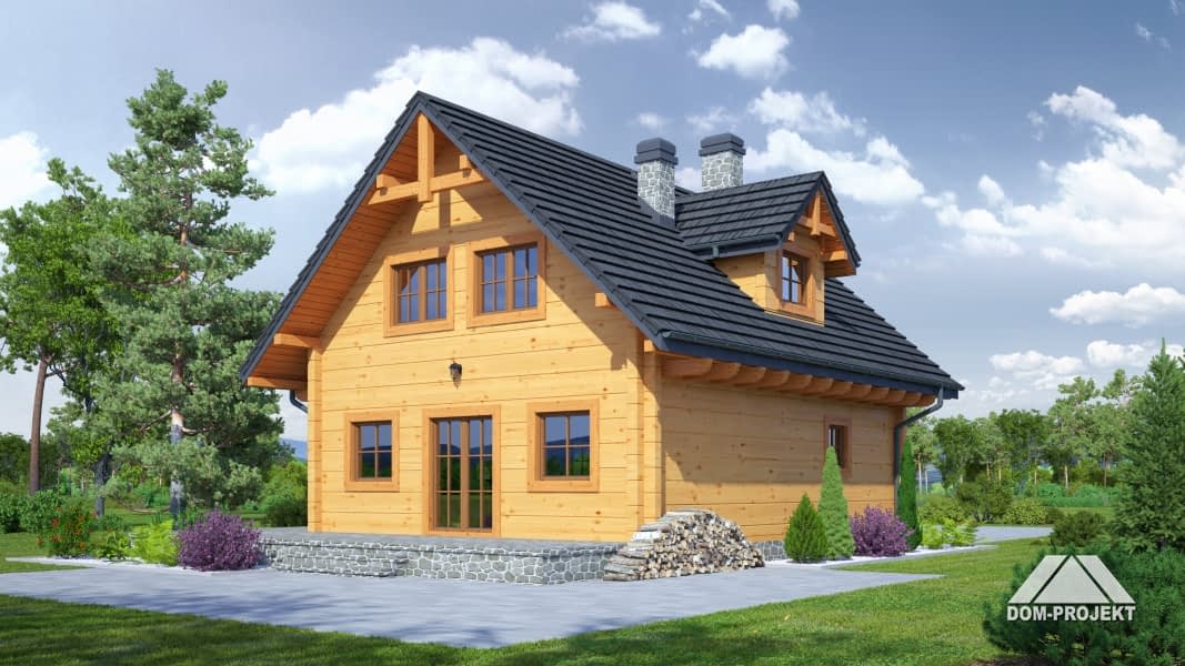 Dom z bali drewnianych. Duży salon z kominkiem, wyjściami na taras i schodami na poddasze. Kuchnia, łazienka, garderoba, korytarz i wiatrołap. Na poddaszu trzy pokoje, łazienka i komunikacja. Zwarta bryła budynku i dach dwuspadowy sprzyjają szybkiej i taniej budowie i niskim kosztom eksploatacji.Rzuty