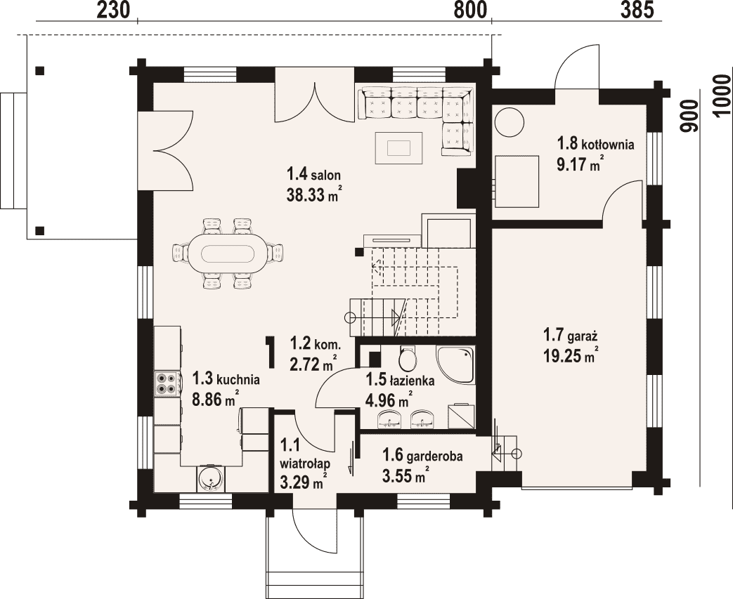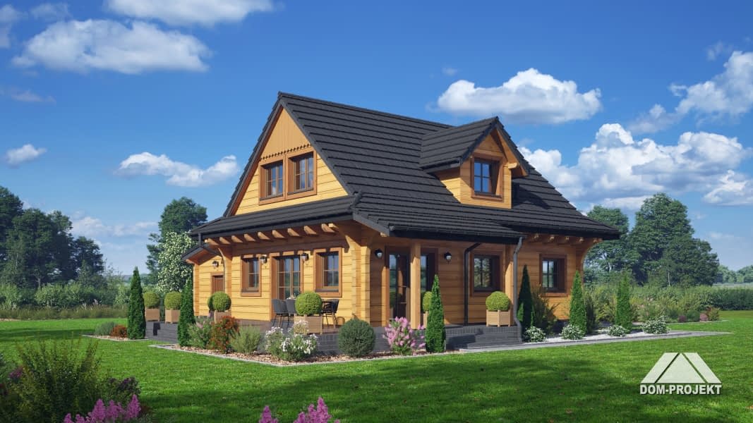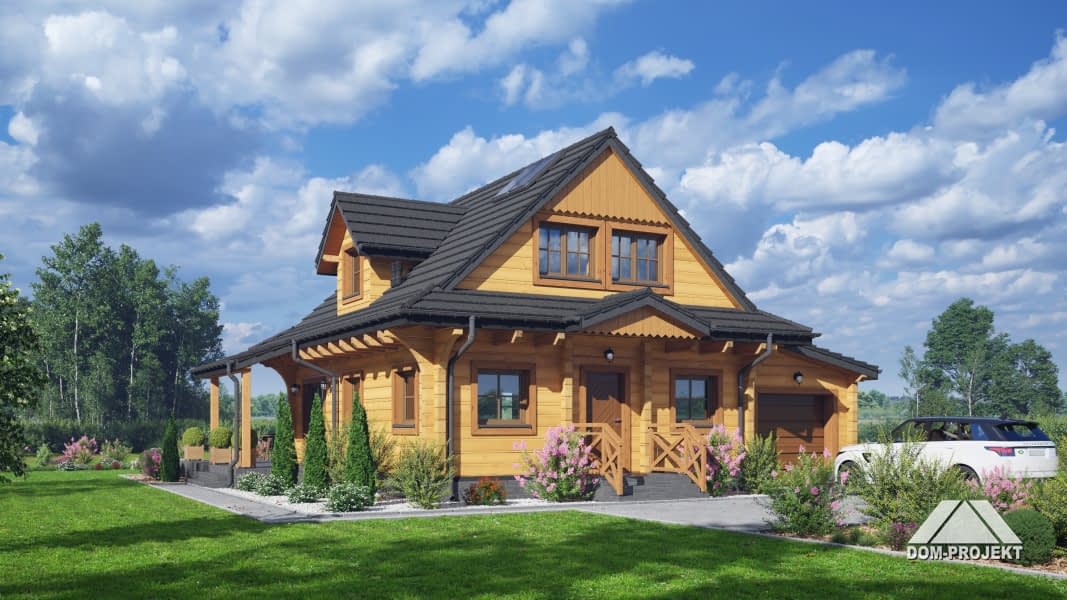 Urokliwy dom z poddaszem użytkowym. Na parterze przestronny, słoneczny salon z kominkiem i wyjściem na taras. Wydzielona kuchnia, łazienka, kotłownia i jednostanowiskowy garaż uzupełniają program użytkowy parteru. Na poddaszu znajdują się trzy wygodne sypialnie oraz łazienka.Rzuty