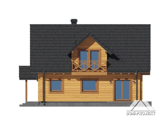 Dom z bali. Na parterze salon z kuchnią, kominkiem, wyjściem na taras i schodami na poddasze. Pokój, łazienka, korytarz, garderoba, wiatrołap. Na poddaszu trzy pokoje, łazienka, komunikacja, Dwa balkony. Zwarta bryła budynku oraz dach dwuspadowy sprzyjają szybkiej i taniej budowie oraz niskim kosztom eksploatacji.Rzuty