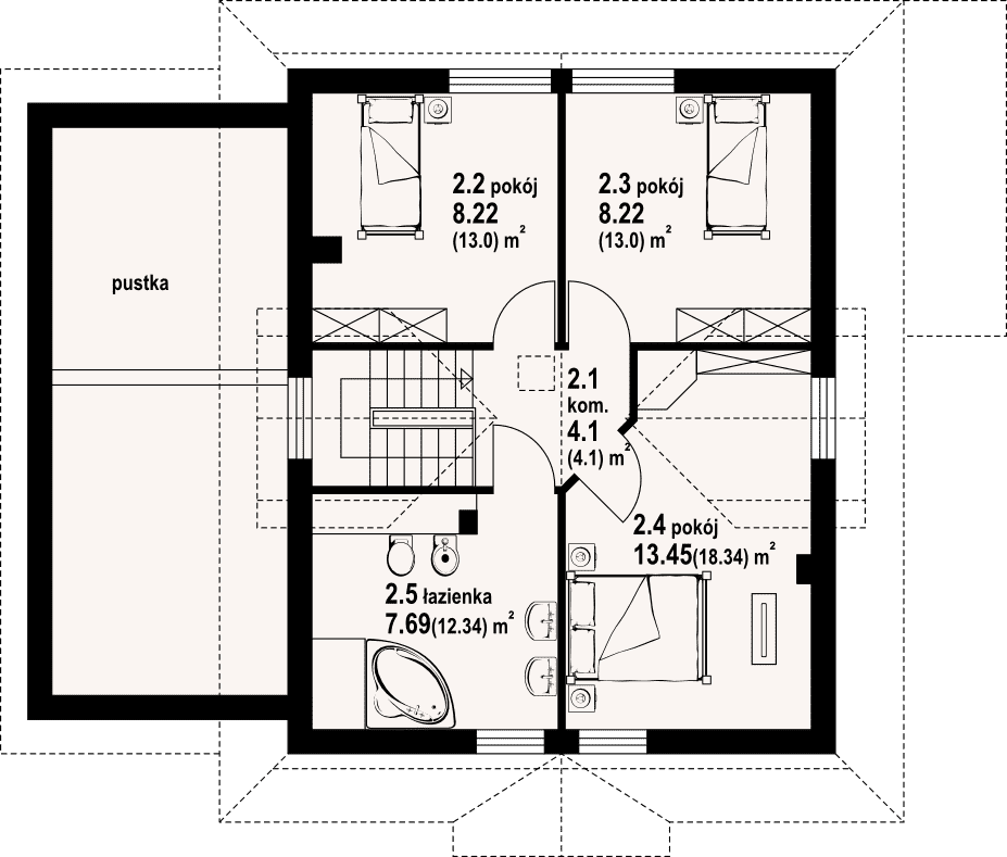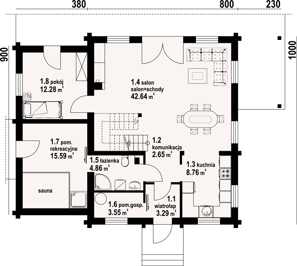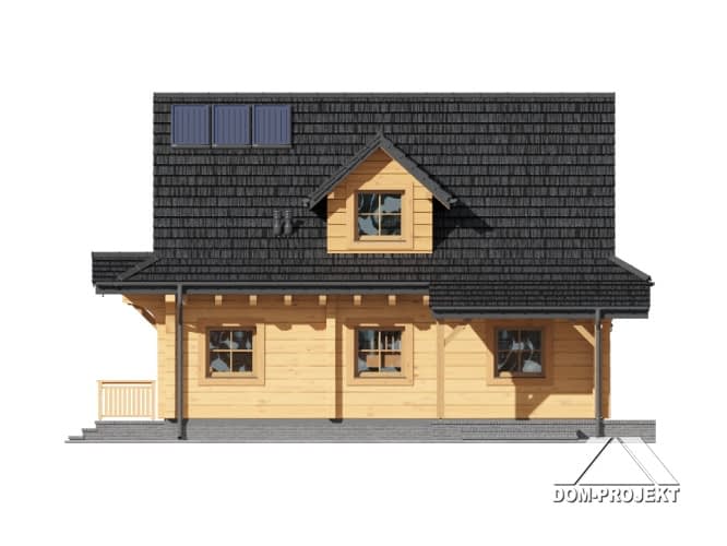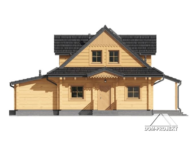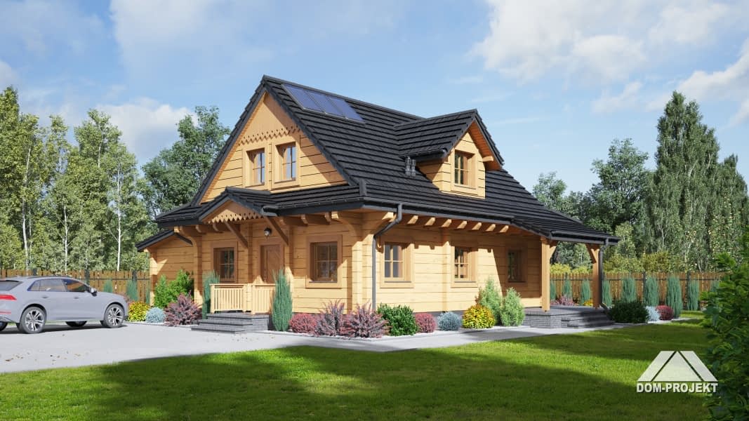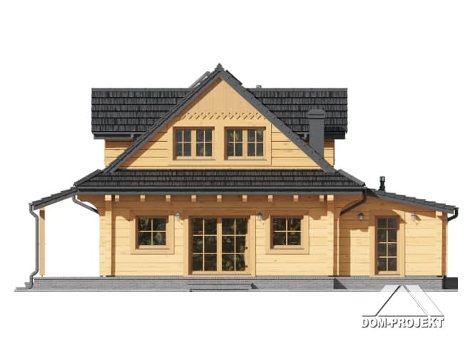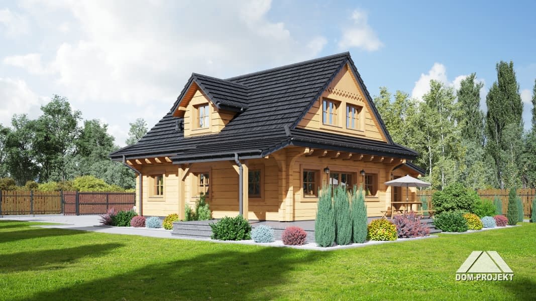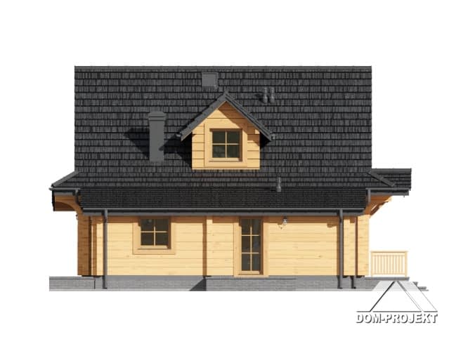 Dom z bali. Duży salon z kominkiem, wyjściem na taras i przejściem do kuchni. Pokój, łazienka, wiatrołap, komunikacja, pomieszczenie gospodarcze. Z łazienki przejście do pomieszczenia rekreacyjnego z sauną. Na poddaszu trzy pokoje, łazienka, komunikacja. Zwarta bryła budynku i dach dwuspadowy sprzyjają szybkiej i taniej budowie i niskim kosztom eksploatacji.Rzuty