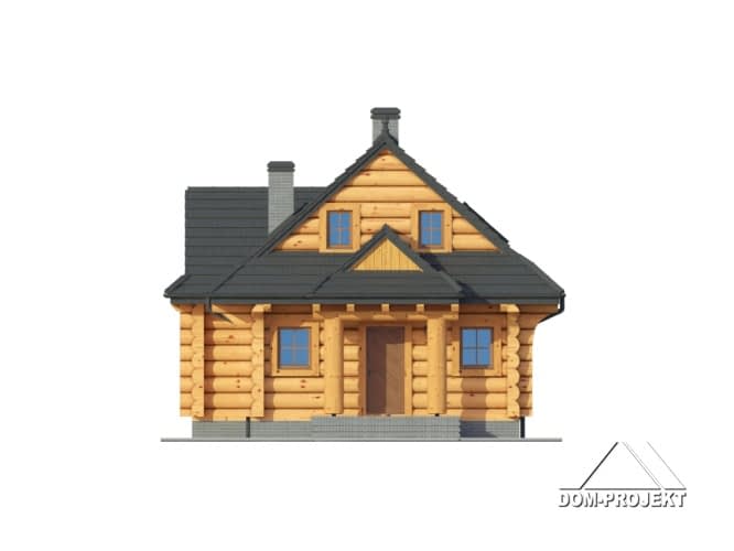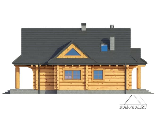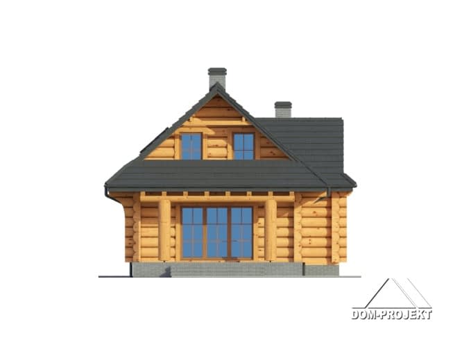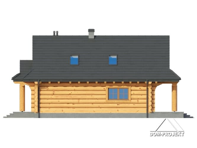 Dom z bali drewnianych. Duży salon z aneksem kuchennym, kominkiem, wyjściem na zadaszony taras i schodami na poddasze. Łazienka, wiatrołap, pomieszczenie gospodarcze. Na poddaszu trzy pokoje, łazienka i balkon.Rzuty