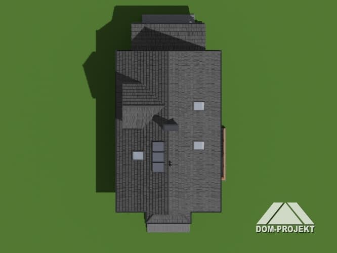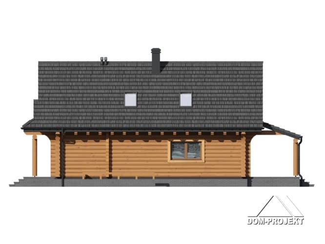 Dom z bali drewnianych. Podpiwniczony. Na parterze duży salon z kuchnią, kominkiem oraz wyjściem na zadaszony taras. Łazienka, garderoba, wiatrołap. Na poddaszu trzy pokoje, łazienka i komunikacja. W piwnicach kotłownia i pralnia. Zwarta bryła budynku i dach dwuspadowy sprzyjają szybkiej i taniej budowie i niskim kosztom eksploatacji.Rzuty