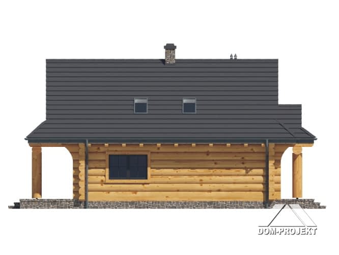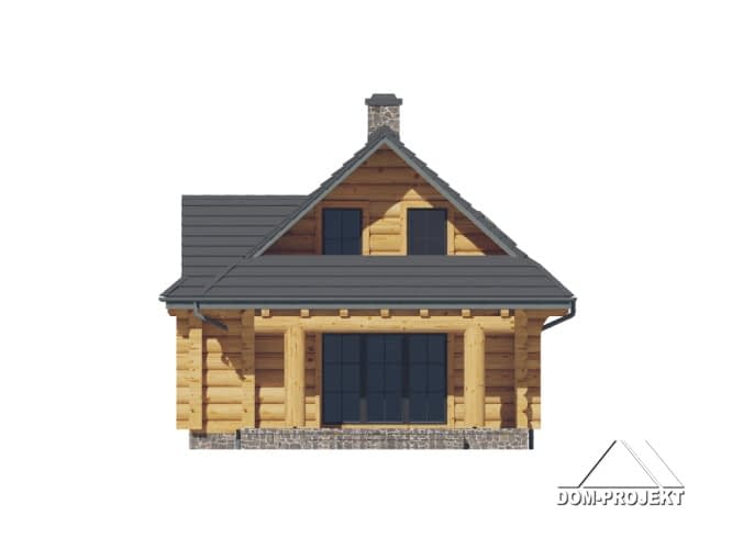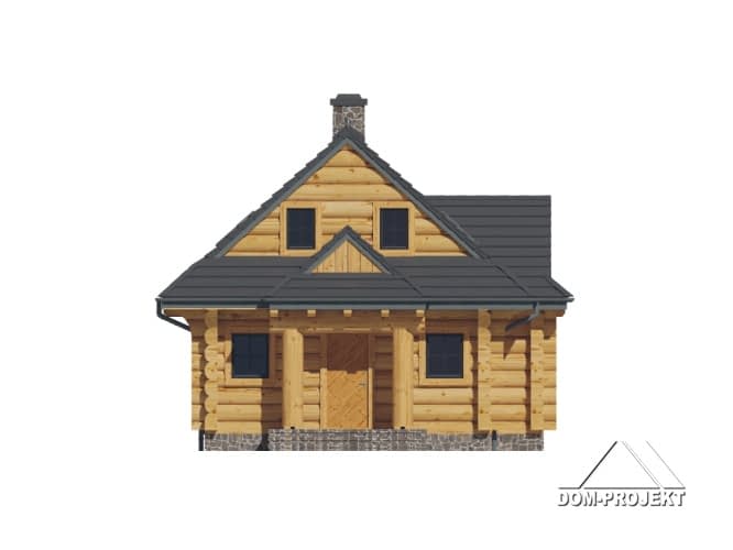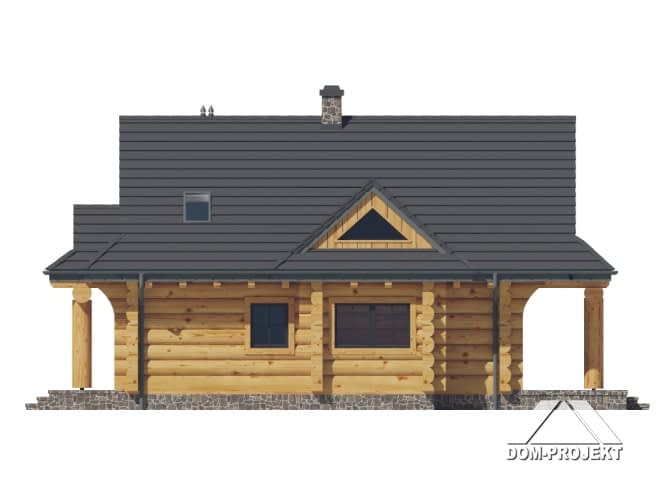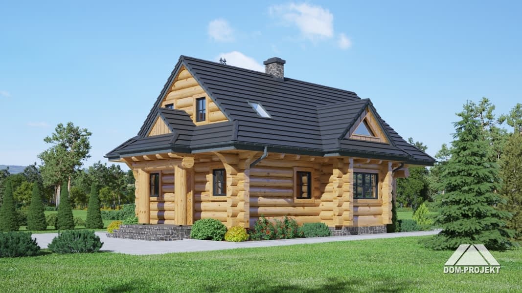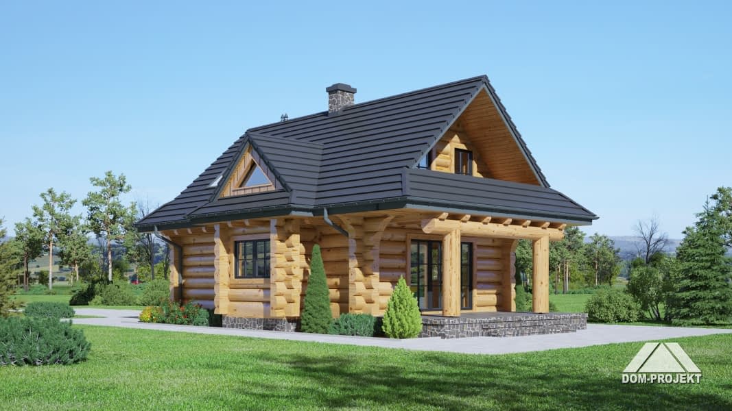 Dom z bali drewnianych. Na parterze salon z kominkiem oraz wyjściem na zadaszony taras. Częściowo otwarta kuchnia, łazienka, wiatrołap oraz pomieszczenie gospodarcze. Na poddaszu trzy pokoje, łazienka, komunikacja. Balkon dostępny z dwóch pokoi. Zwarta bryła budynku oraz dach dwuspadowy sprzyjają szybkiej i taniej budowie oraz niskim kosztom eksploatacji.Rzuty