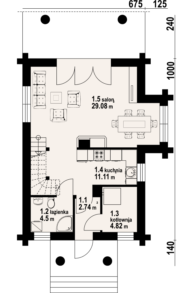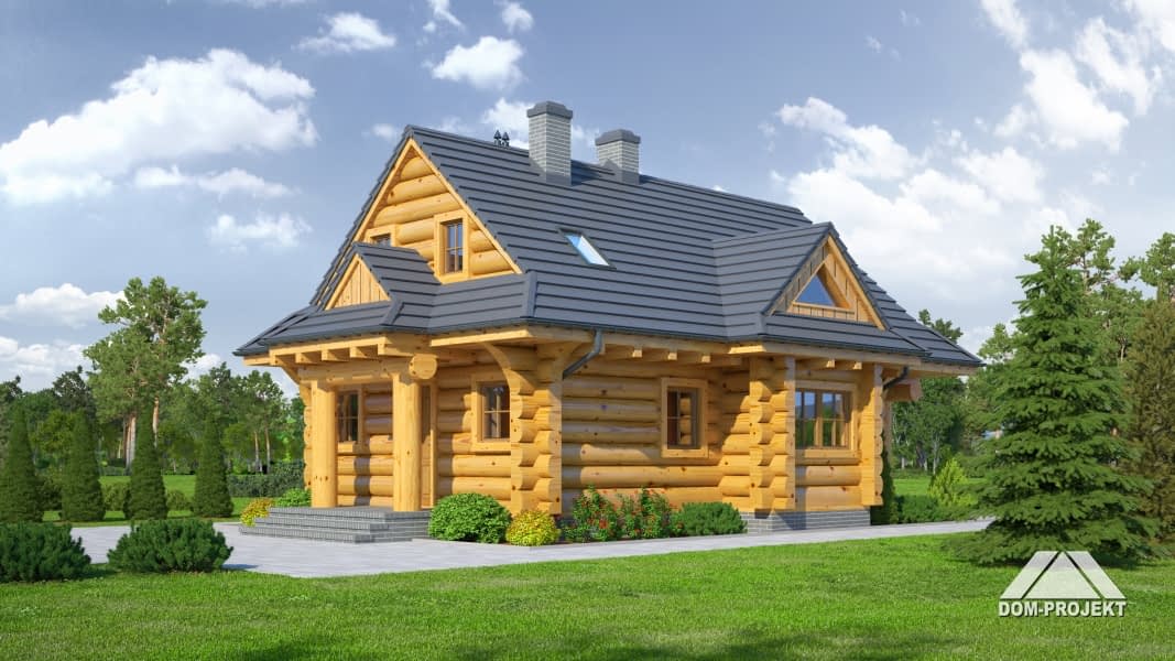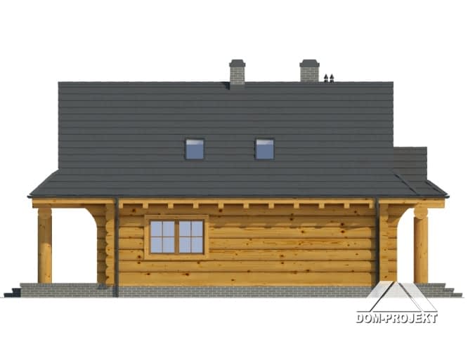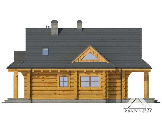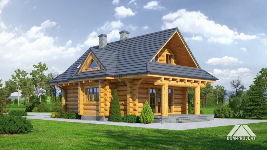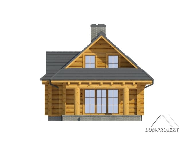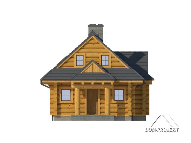 Nieduży dom z bali drewnianych. Duży salon z aneksem kuchennym, kominkiem, wyjściem na duży taras i schodami na poddasze. Łazienka, kotłownia, wiatrołap. Na poddaszu trzy pokoje, łazienka i komunikacja. Dwa pokoje mają balkon.Rzuty