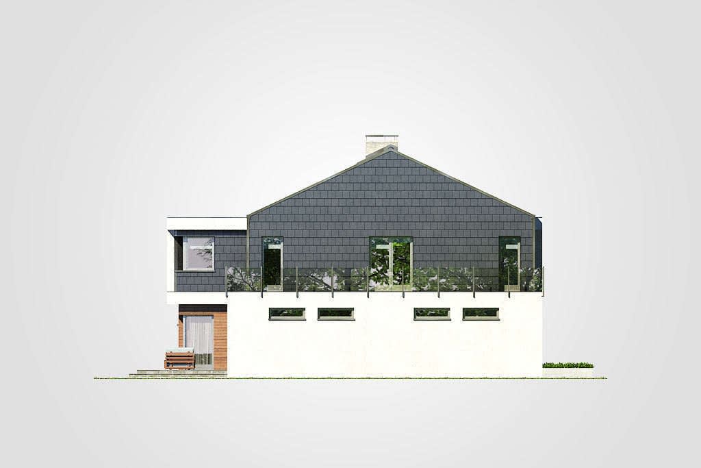 Dom piętrowy z dwuspadowym dachem w nowoczesnej bryle, niezadaszonym tarasem wypoczynkowym, przestronnym balkonem i garażem 2-stanowiskowymKonstrukcja