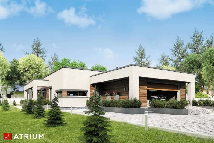 Nowoczesny energooszczędny dom parterowy z 4 sypialniami, z płaskim dachem, pergolą oraz dwustanowiskowym garażem