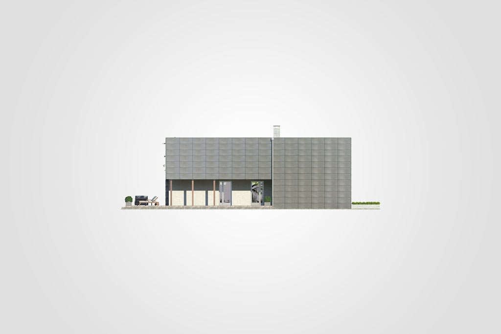 ściany ceramiczne 25 cm + 20 cm ocieplenia w systemie Termo Organika, wykończenie ścian: tynk, panele elewacyjne stalowe lub aluminiowe, lub płyta cementowo-włóknowa, pokrycie dachu - papa termozgrzewalna, ew. membrana dachowa. Brama garażowa i drzwi zewnętrzne marki Hörmann.Rzuty
