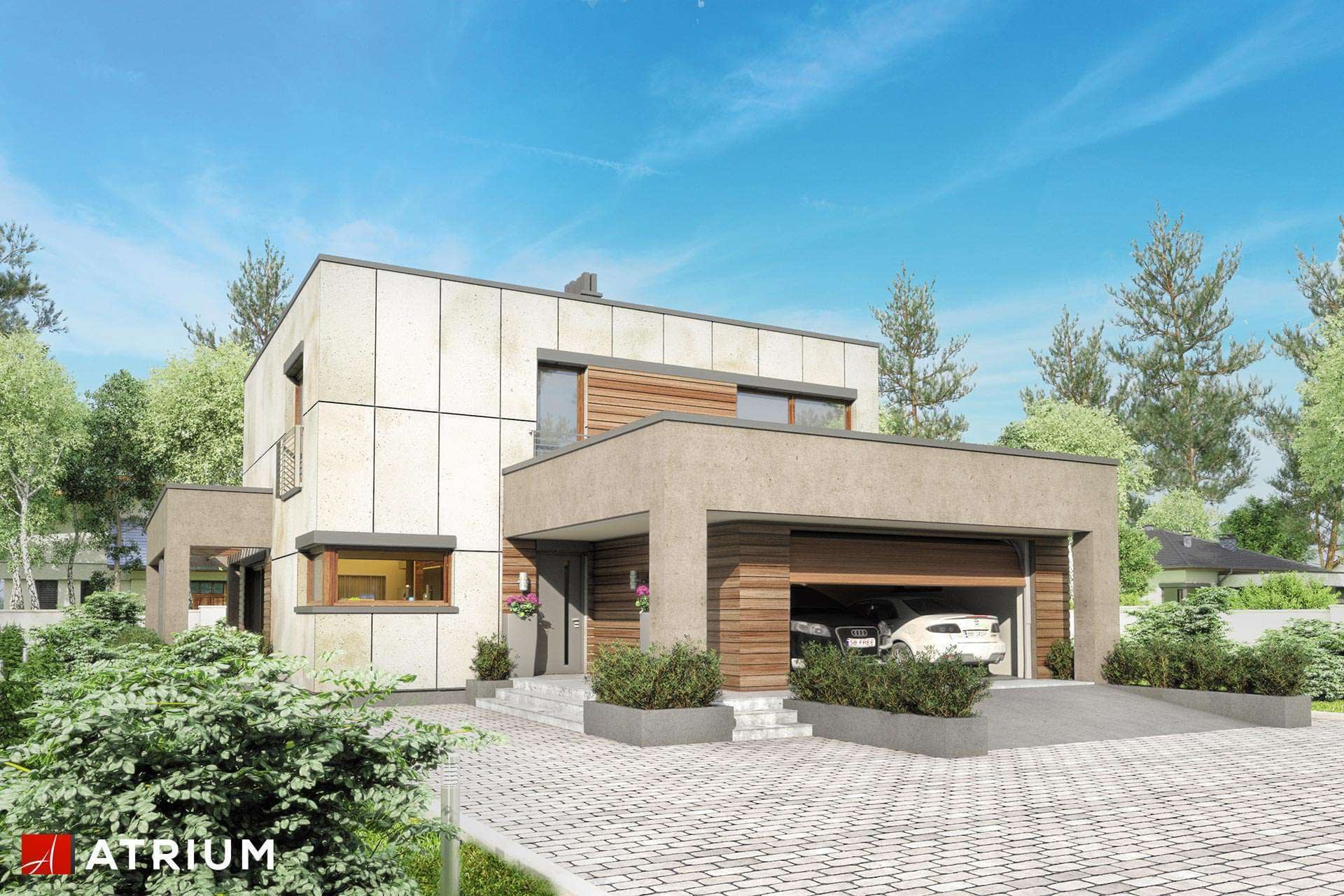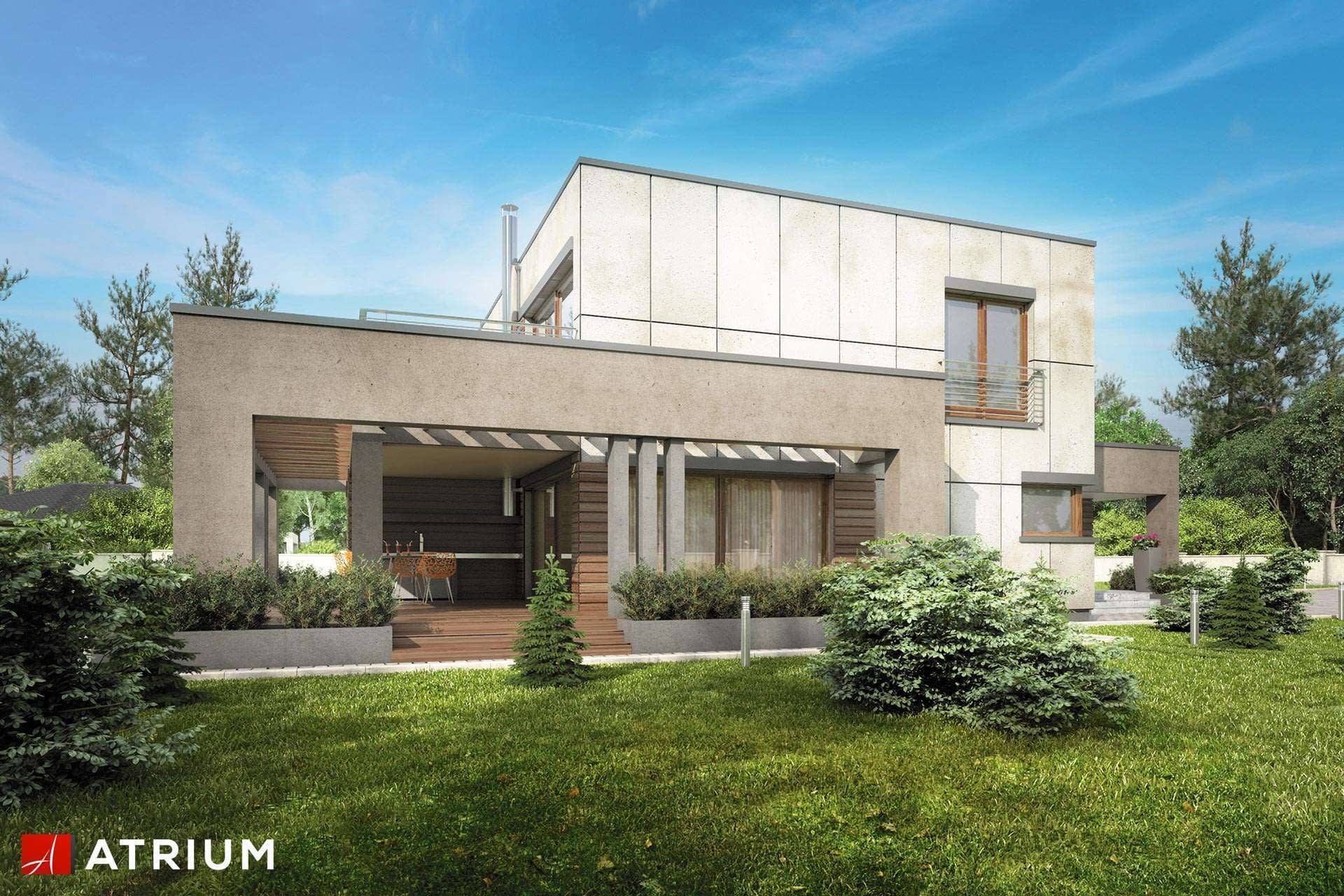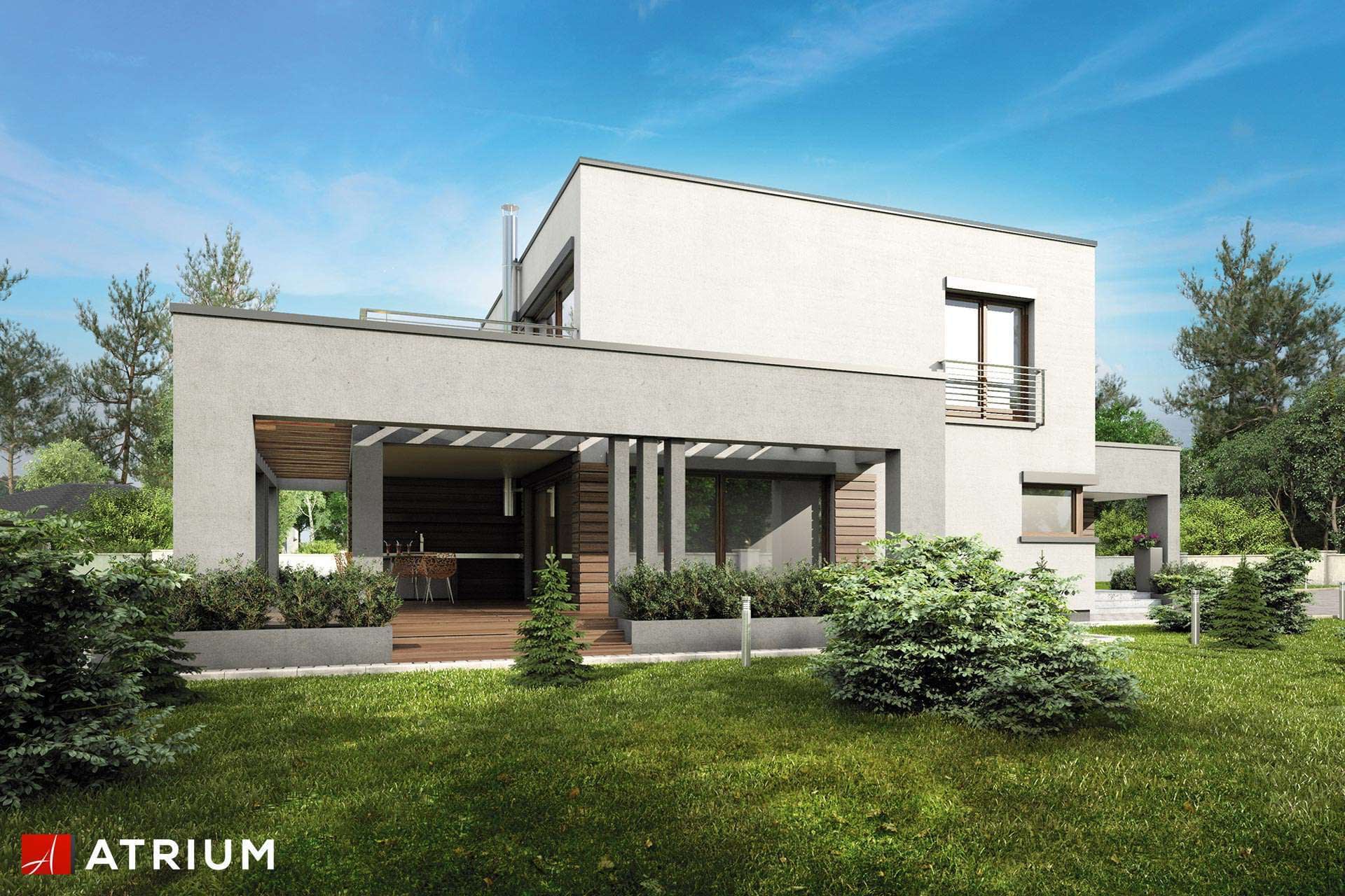 Piętrowy dom z płaskim dachem w nowoczesnej stylistyce, z tarasem w podcieniu i oryginalną pergolą, garażem 2-stanowiskowymKonstrukcja