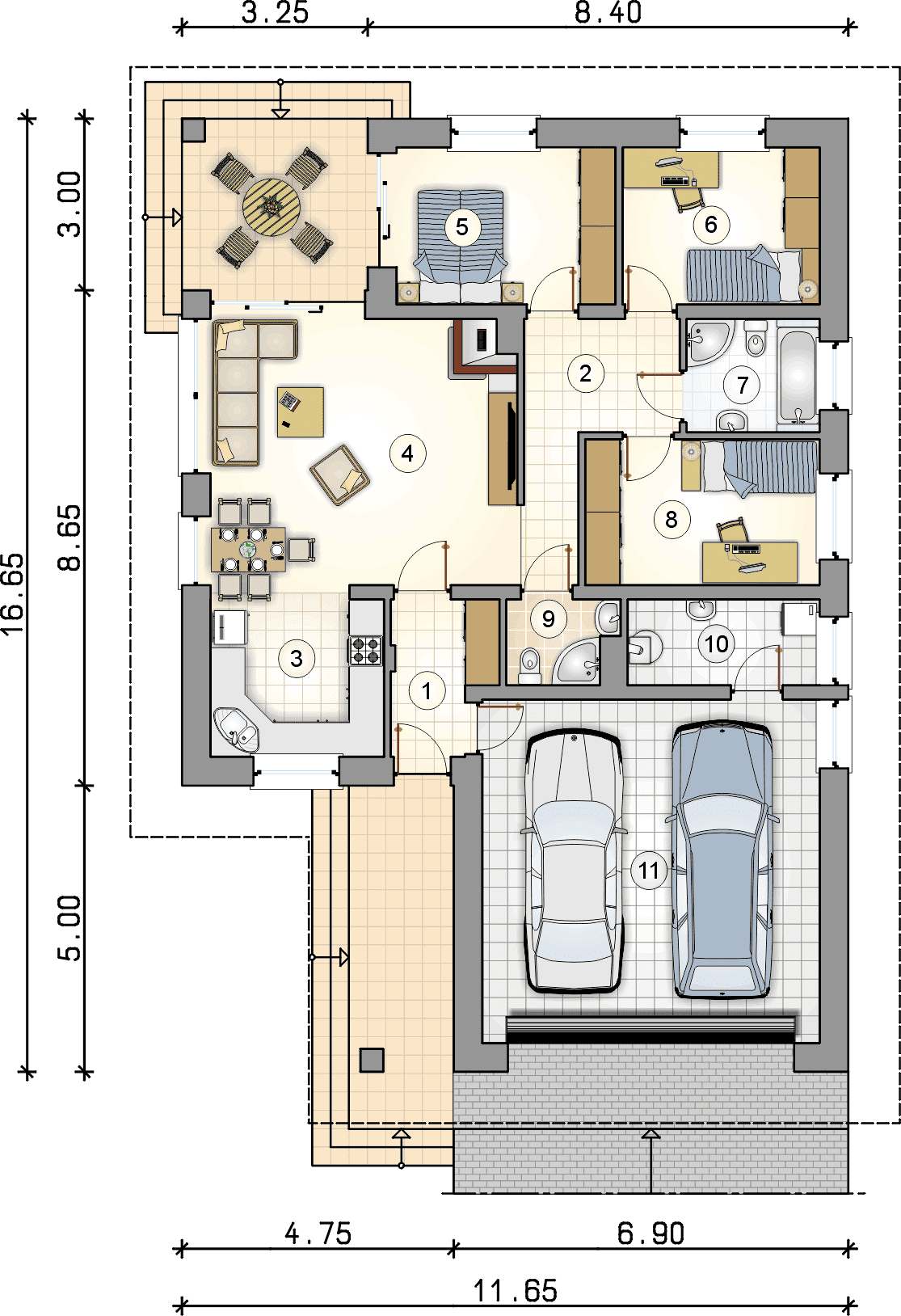 Niewielki dom parterowy z zadaszonym tarasem oraz garażem dwustanowiskowym