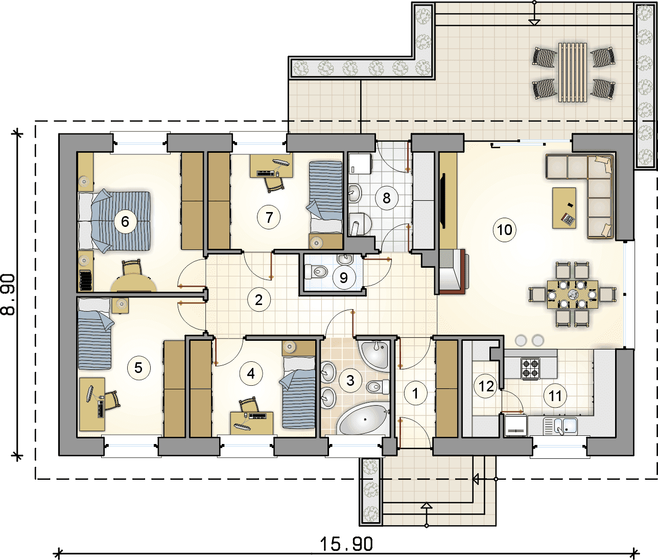 Dom parterowy z 4 sypialniami, klasycznym dwuspadowym dachem, bez podpiwniczenia i garażu