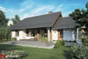 Dom jednorodzinny, parterowy, z kotłownią na paliwo stałe, dwuspadowym dachem i zadaszonym tarasem