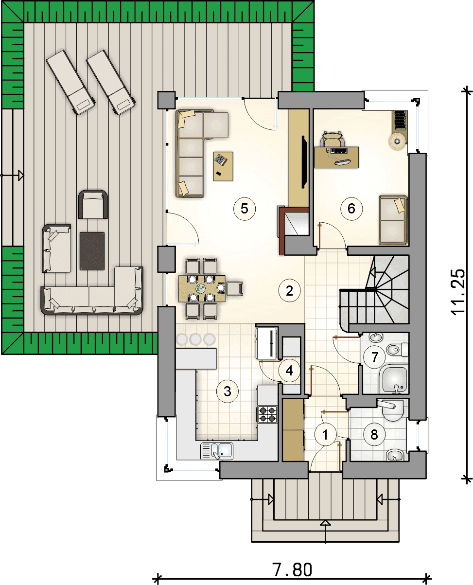 Technologia murowana: pustak ceramiczny gr. 30 cm + ocieplenie w systemie Termo Organika. Pokrycie dachu: dachówka. Drzwi zewnętrzne marki Hörmann.Rzuty