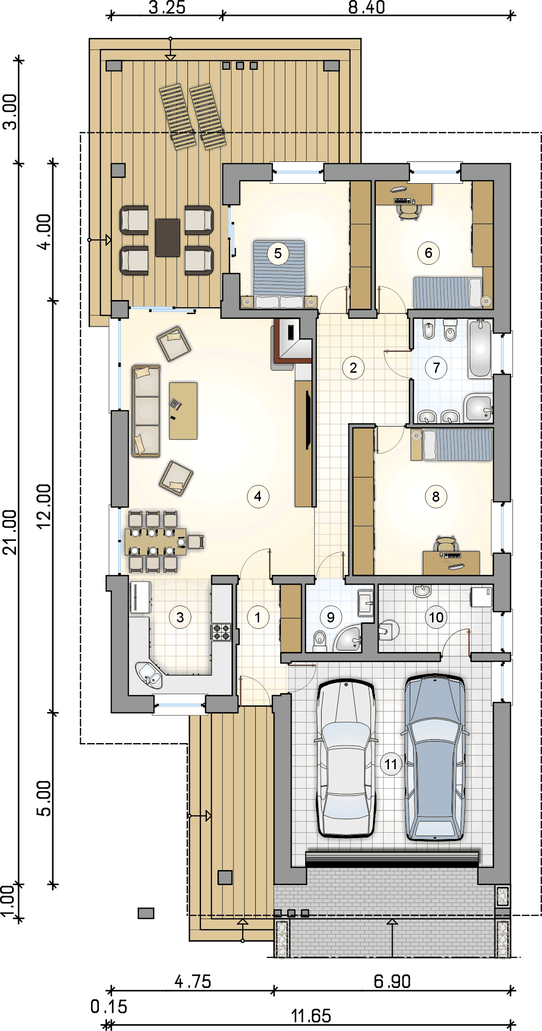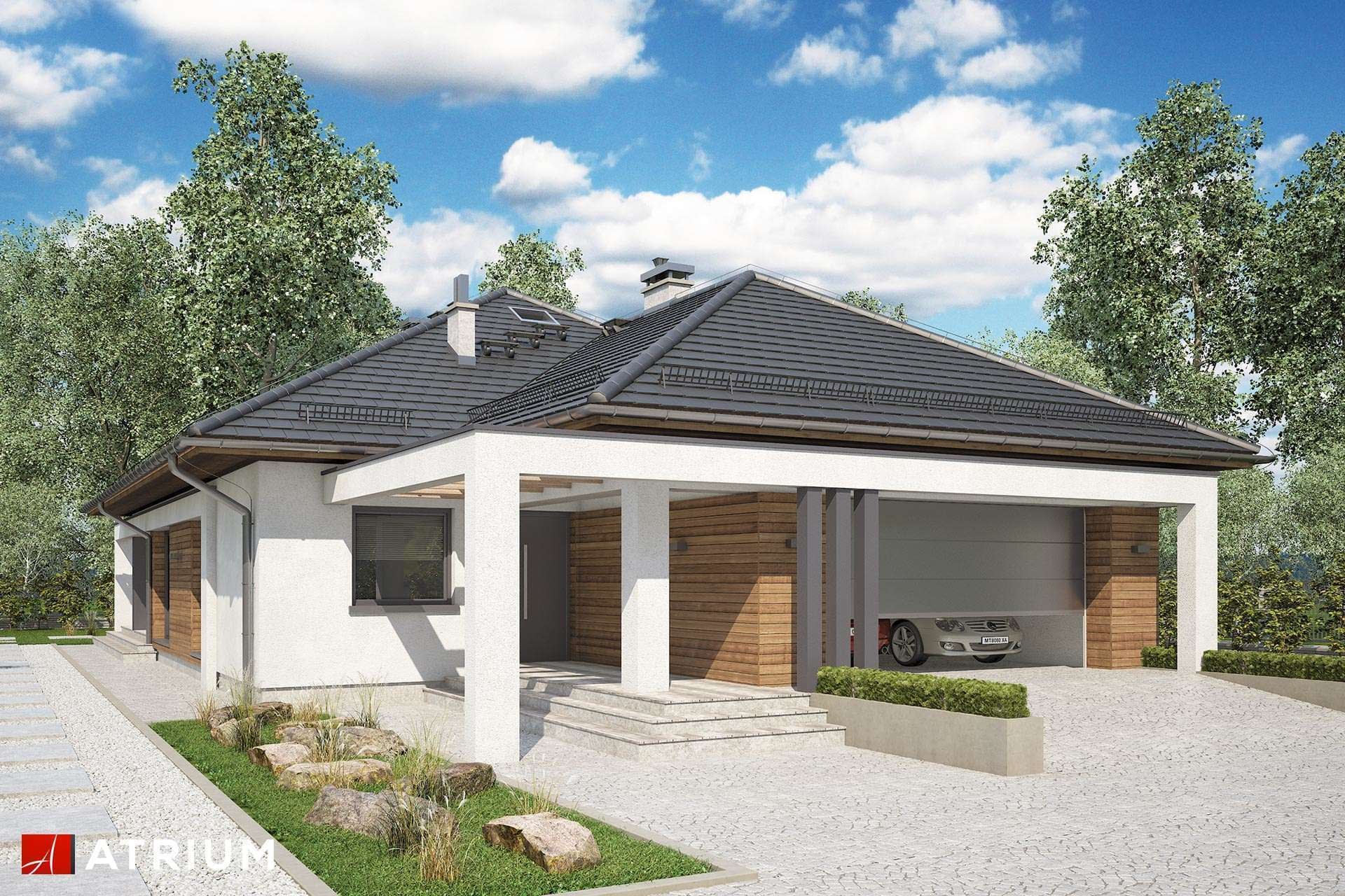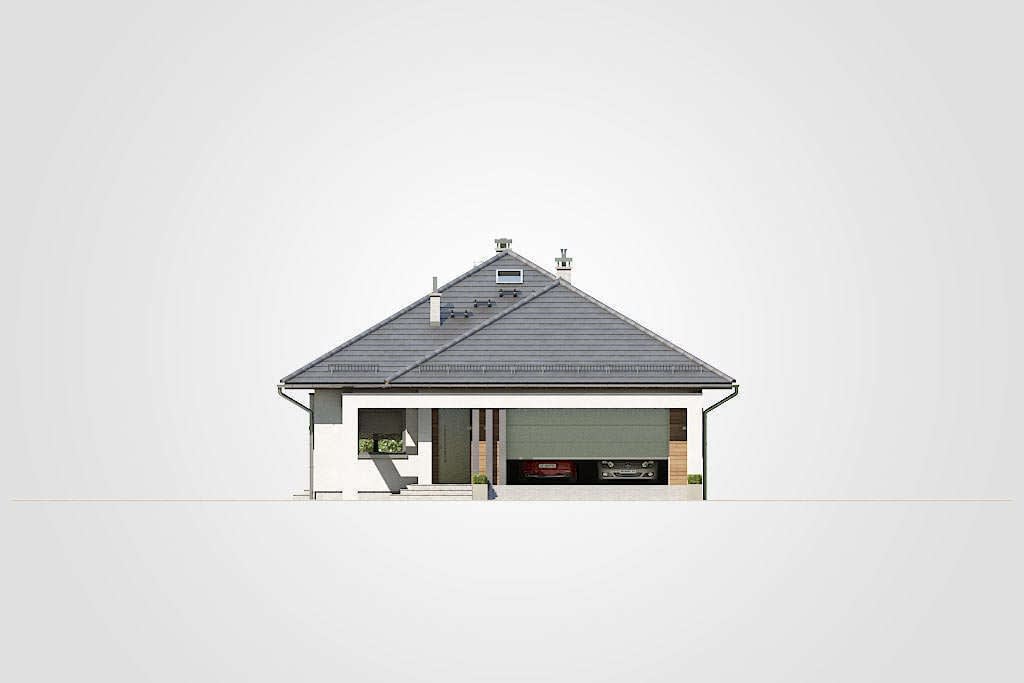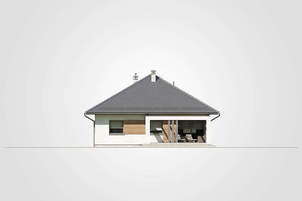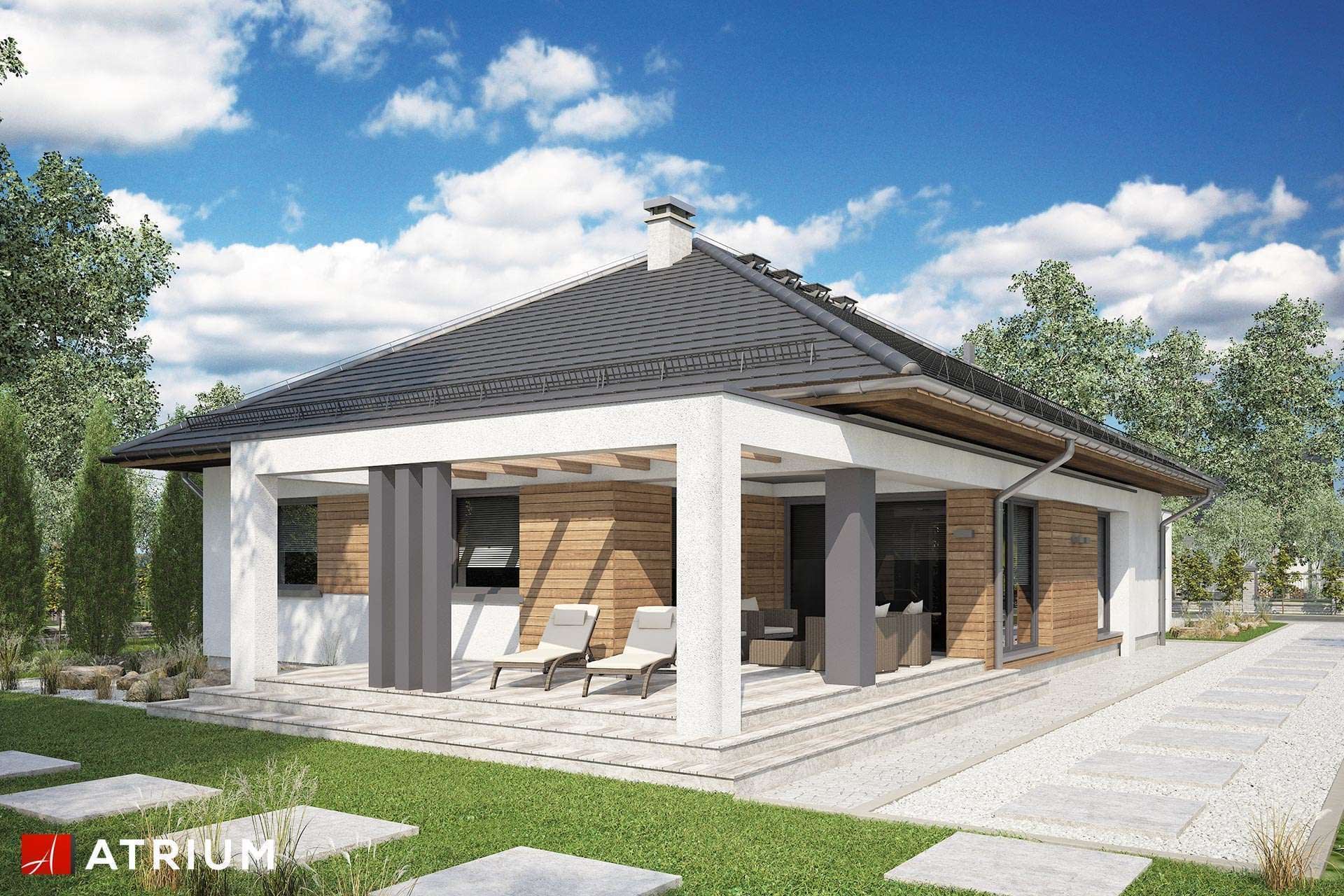 Dom jednorodzinny, parterowy z dwustanowiskowym garażem i zadaszonym tarasem z pergolami, przykryty czterospadowym dachemKonstrukcja