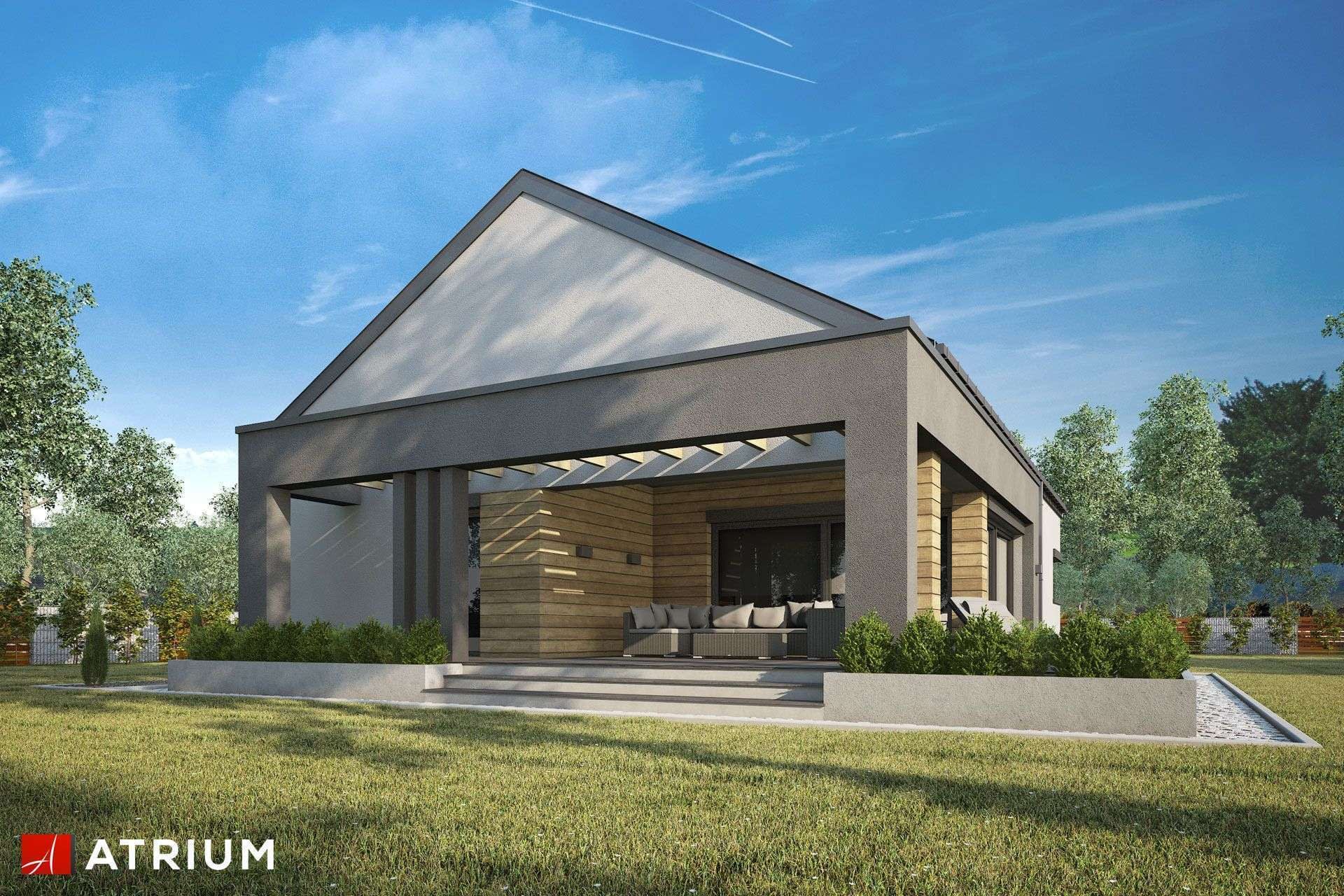 Parterowy nowoczesny dom z dwuspadowym dachem bez okapów i zadaszonym tarasem, pergolą i płaskim dachem nad jednostanowiskowym garażem