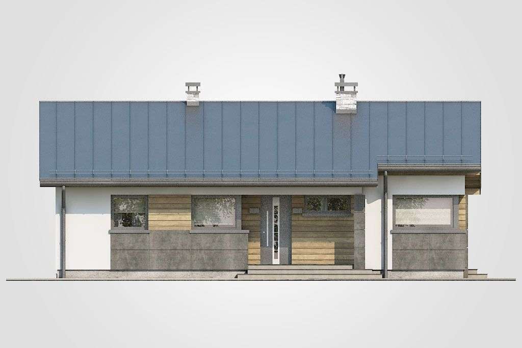 Mały parterowy dom bez garażu, z trzema sypialniami, dwuspadowym dachem i częściowo zadaszonym tarasemKonstrukcja