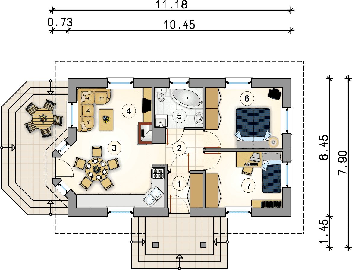 Niewielki dom parterowy z tarasem ulokowanym w bocznej części budynkuKonstrukcja