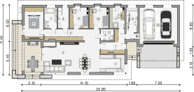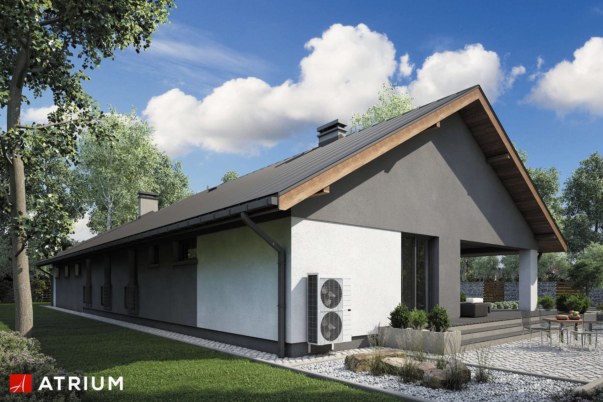 Parterowy dom z dwustanowiskowym garażem i zadaszonym tarasem, na działki z wjazdem od południa lub zachodu, z pompą ciepła